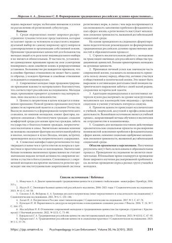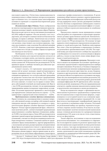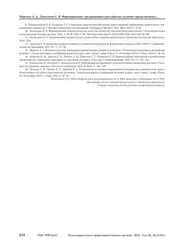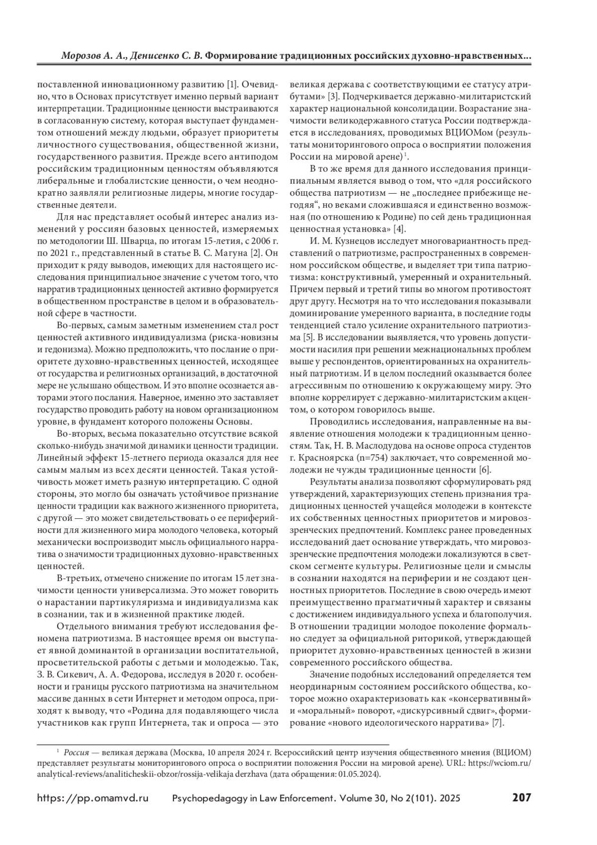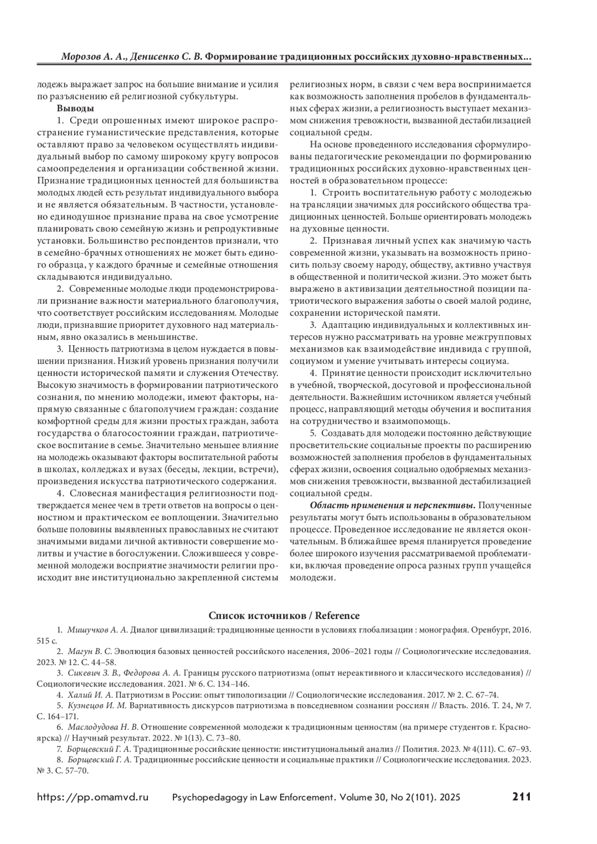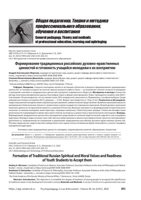 МОРОЗОВ А. А., ДЕНИСЕНКО С. В. ФОРМИРОВАНИЕ ТРАДИЦИОННЫХ РОССИЙСКИХ ДУХОВНО-НРАВСТВЕННЫХ ЦЕННОСТЕЙ И ГОТОВНОСТЬ УЧАЩЕЙСЯ МОЛОДЕЖИ К ИХ ВОСПРИЯТИЮ // ПСИХОПЕДАГОГИКА В ПРАВООХРАНИТЕЛЬНЫХ ОРГАНАХ. 2025. № 2 (101), ТОМ 30