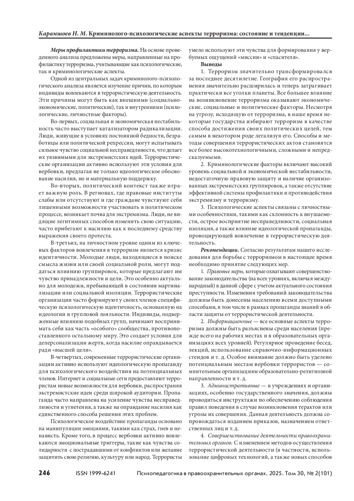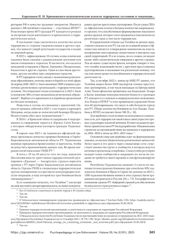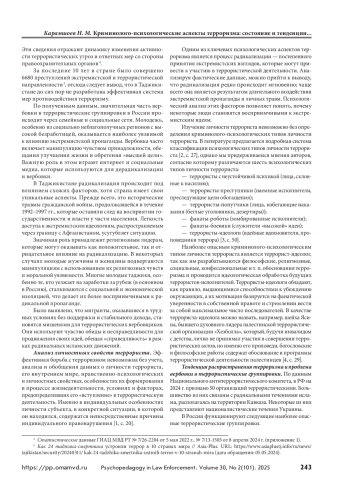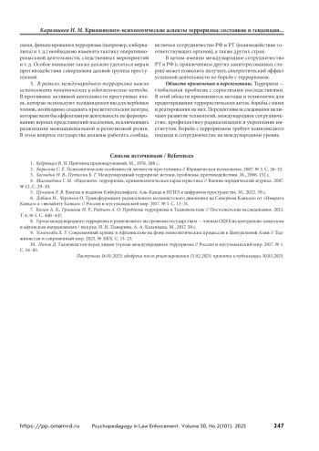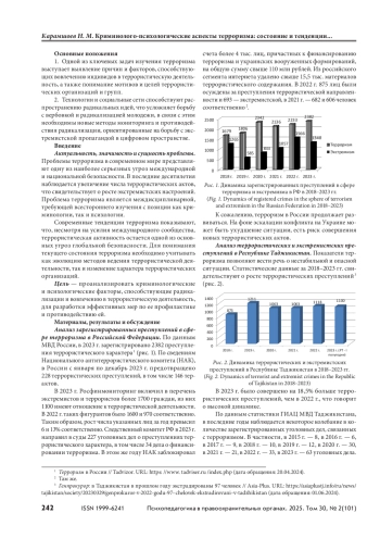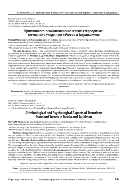 Цель — проанализировать криминологические и психологические факторы, способствующие радикализации и вовлечению в террористическую деятельность, для разработки эффективных мер по ее профилактике и противодействию ей. Материалы, результаты и обсуждение. Использованы данные о террористической активности в России и Таджикистане за последние 10 лет. Рассматриваются криминолого-психологические аспекты терроризма, анализируются современные тенденции и состояние этого явления. Особое внимание уделено исследованию психологических факторов, влияющих на формирование террористических убеждений и мотивов, а также криминологическому анализу террористической деятельности. Изучены причины, по которым индивиды вовлекаются в террористические организации, а также методы противодействия их радикализации. Выводы. В России и Таджикистане наблюдается тенденция к росту количества террористических актов, терроризм по-прежнему остается серьезной проблемой для обеих стран. Психологические аспекты терроризма в этих странах имеют свои особенности, и для эффективной борьбы с ним необходимо учитывать как политические и идеологические мотивы в России, так и экономические и социальные факторы в Таджикистане. Важным направлением работы является профилактика терроризма, прежде всего нацеленной на молодежь, а также уделение большего внимания социально-экономическим факторам, способствующим росту террористической активности.