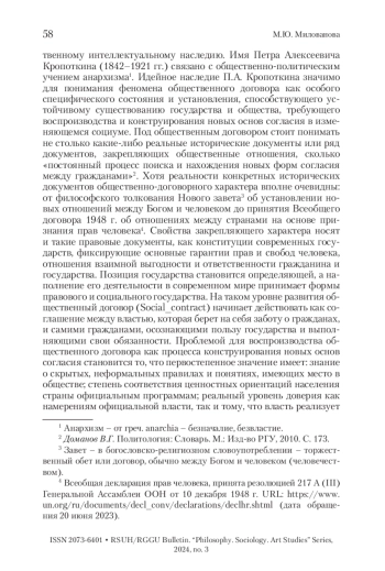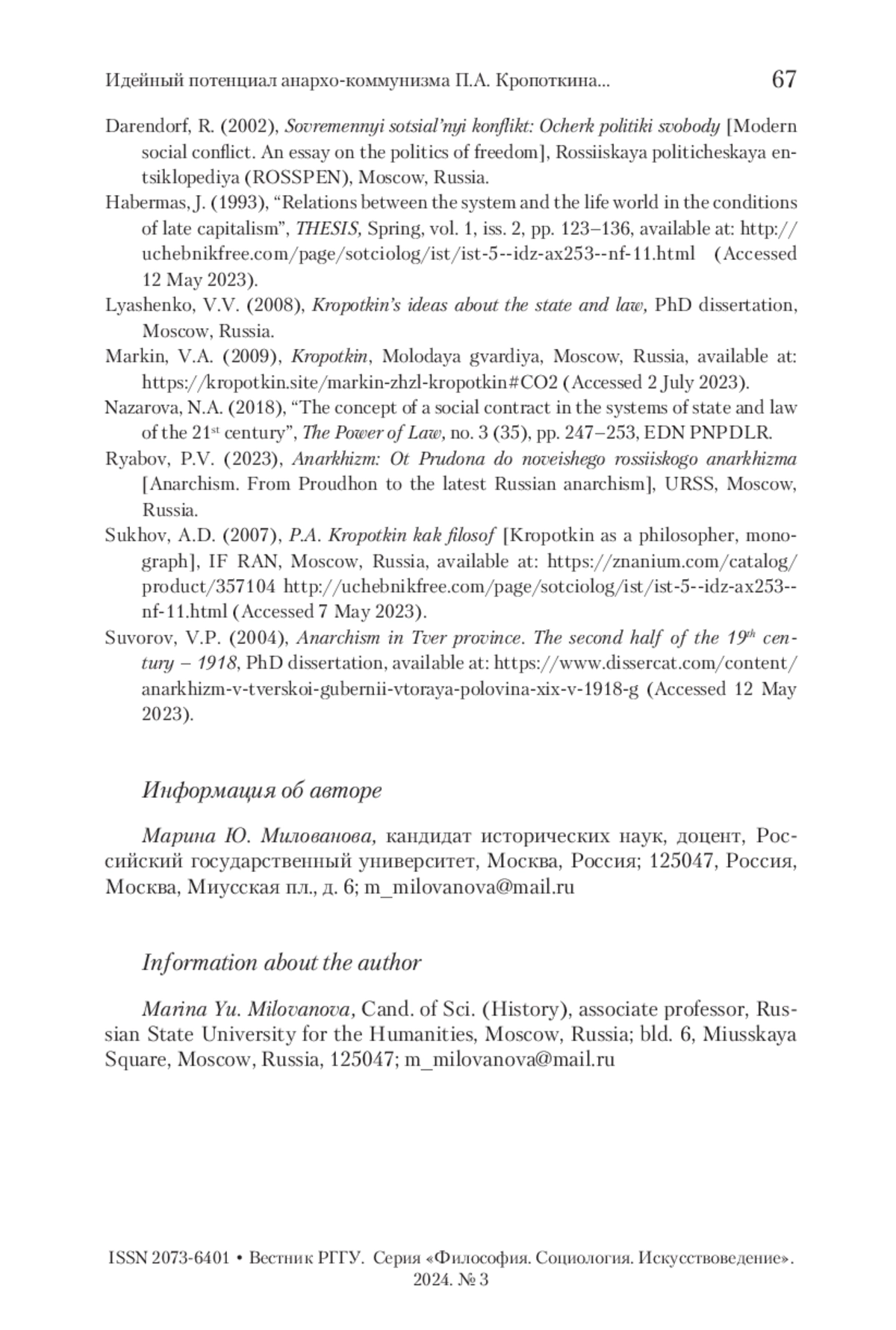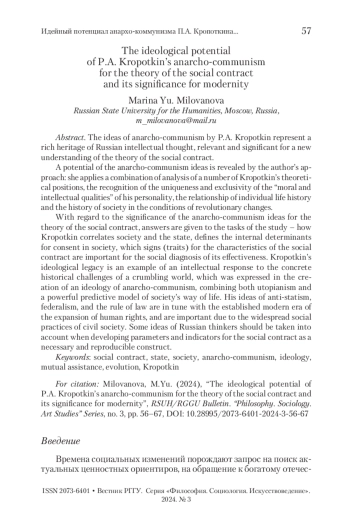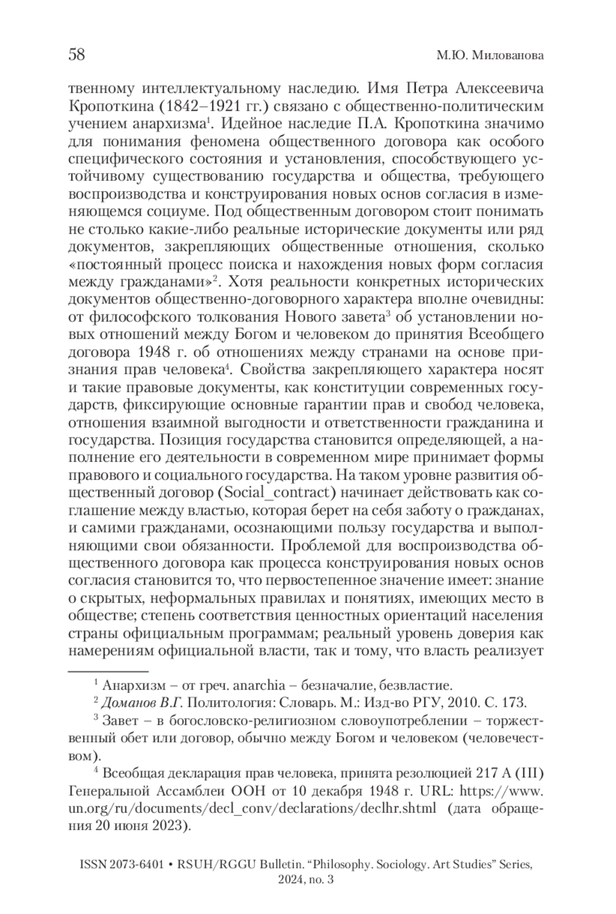 МИЛОВАНОВА М. Ю. ИДЕЙНЫЙ ПОТЕНЦИАЛ АНАРХО-КОММУНИЗМА П. А. КРОПОТКИНА ДЛЯ ТЕОРИИ ОБЩЕСТВЕННОГО ДОГОВОРА И ЕГО ЗНАЧЕНИЕ ДЛЯ СОВРЕМЕННОСТИ // ВЕСТНИК РГГУ. СЕРИЯ: ФИЛОСОФИЯ. СОЦИОЛОГИЯ. ИСКУССТВОВЕДЕНИЕ. 2024. № 3