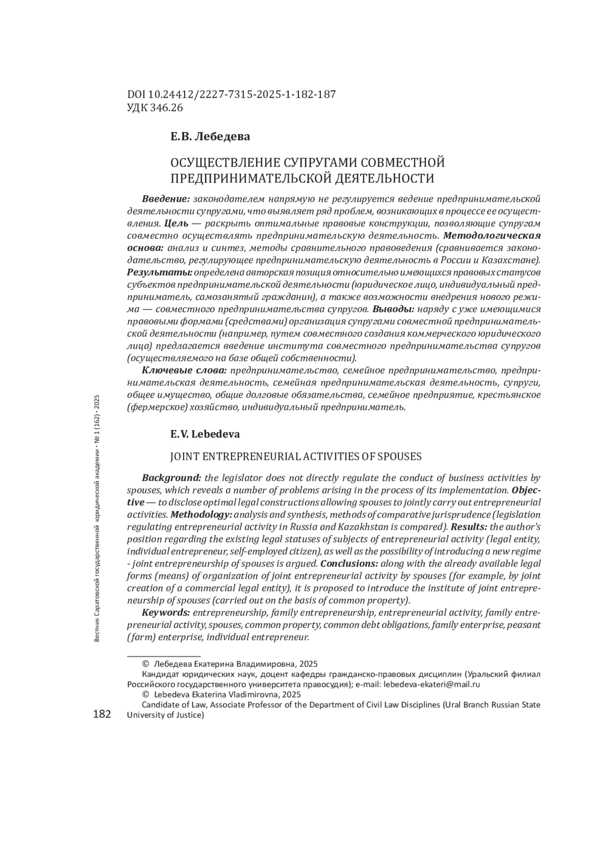 ЛЕБЕДЕВА Е. В. ОСУЩЕСТВЛЕНИЕ СУПРУГАМИ СОВМЕСТНОЙ ПРЕДПРИНИМАТЕЛЬСКОЙ ДЕЯТЕЛЬНОСТИ // ВЕСТНИК САРАТОВСКОЙ ГОСУДАРСТВЕННОЙ ЮРИДИЧЕСКОЙ АКАДЕМИИ. 2025. № 1 (162)