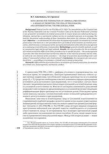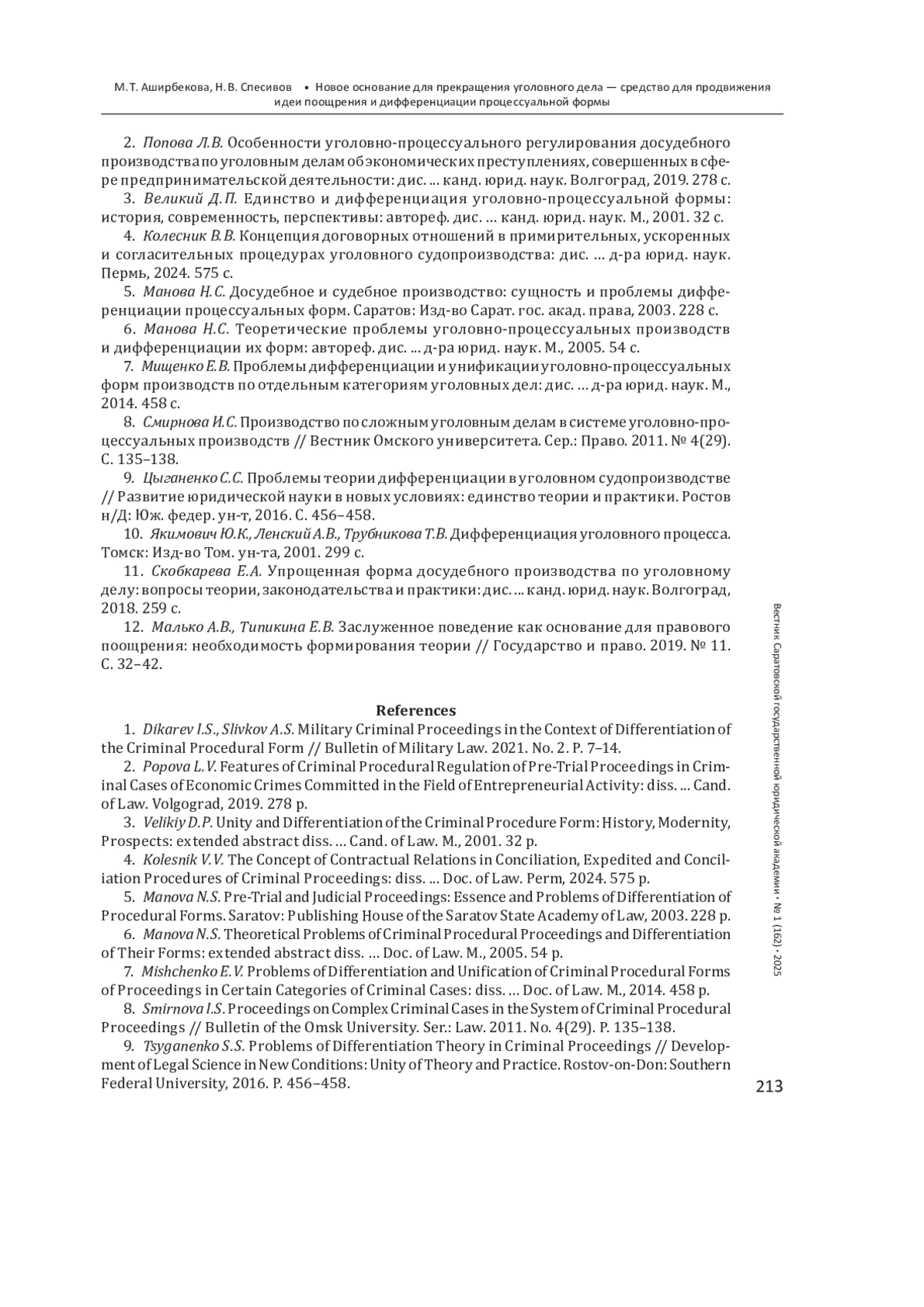 АШИРБЕКОВА М. Т., СПЕСИВОВ Н. В. НОВОЕ ОСНОВАНИЕ ДЛЯ ПРЕКРАЩЕНИЯ УГОЛОВНОГО ДЕЛА - СРЕДСТВО ДЛЯ ПРОДВИЖЕНИЯ ИДЕИ ПООЩРЕНИЯ И ДИФФЕРЕНЦИАЦИИ ПРОЦЕССУАЛЬНОЙ ФОРМЫ // ВЕСТНИК САРАТОВСКОЙ ГОСУДАРСТВЕННОЙ ЮРИДИЧЕСКОЙ АКАДЕМИИ. 2025. № 1 (162)