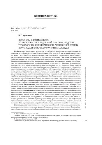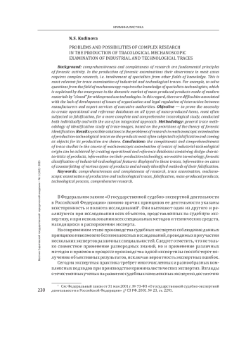 Введение: всесторонность и полнота исследований являются основополагающими принципами судебно-экспертной деятельности. При производстве криминалистических экспертиз их соблюдение в большинстве случаев требует комплексных исследований, то есть привлечения специалистов из других областей знаний. Это наиболее актуально для трасологической экспертизы производственно-технологических следов. Например, для решения вопросов из области механоскопии требуются знания специалистов-технологов, что объясняется появлением на отечественном рынке изделий массового производства, изготовленных из современных материалов по «закрытым» для широкого использования технологиям. В связи с этим возникают трудности, связанные с отсутствием разработки вопросов организации и правового регулирования взаимодействия между производителями и экспертными службами органов исполнительной власти. Цель - доказать необходимость создания оперативно-справочных баз данных по всем типам изделий массового производства, наиболее часто подвергающихся фальсификации, для более полного и всестороннего трасологического исследования, проводимого как единолично, так и с применением комплексного подхода.