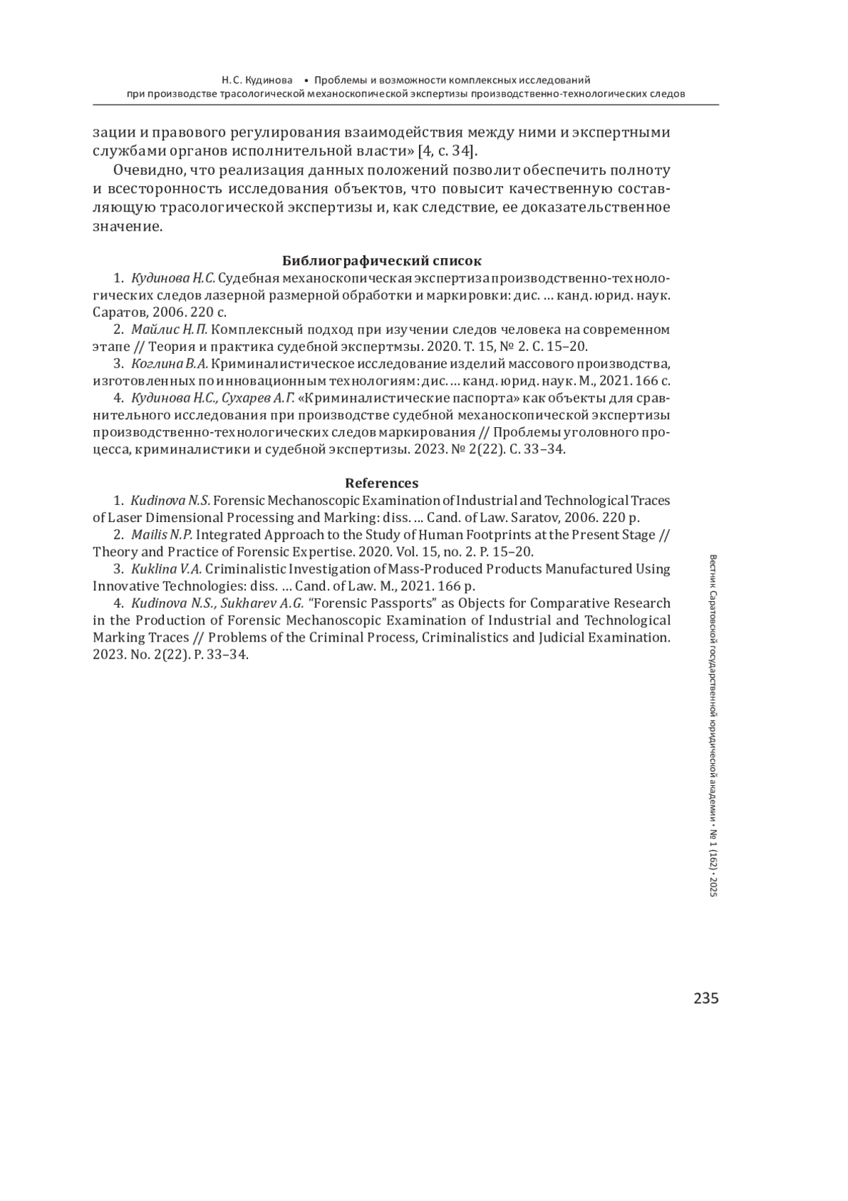 4. Кудинова Н.С., Сухарев А. Г. “Криминалистические паспорта” как объекты для сравнительного исследования при производстве судебной механоскопической экспертизы производственно-технологических следов маркирования // Проблемы уголовного процесса, криминалистики и судебной экспертизы. 2023. № 2(22). С. 33-34. EDN: HBOLYZ