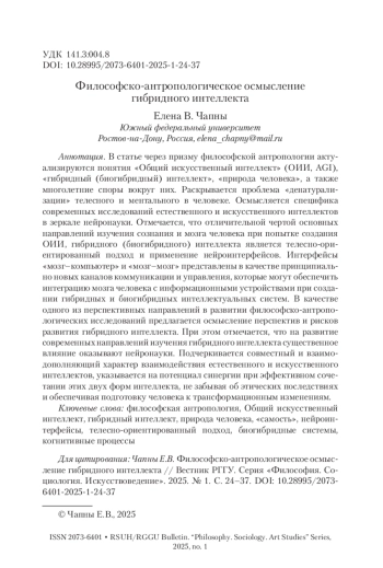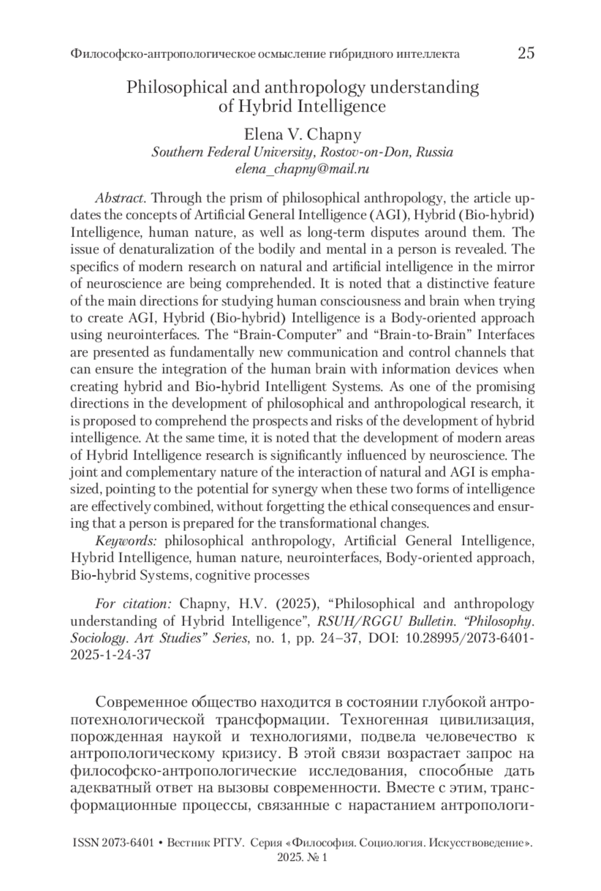 В статье через призму философской антропологии актуализируются понятия «Общий искусственный интеллект» (ОИИ, AGI), «гибридный (биогибридный) интеллект», «природа человека», а также многолетние споры вокруг них. Раскрывается проблема «денатурализации» телесного и ментального в человеке. Осмысляется специфика современных исследований естественного и искусственного интеллектов в зеркале нейронауки. Отмечается, что отличительной чертой основных направлений изучения сознания и мозга человека при попытке создания ОИИ, гибридного (биогибридного) интеллекта является телесно-ориентированный подход и применение нейроинтерфейсов. Интерфейсы «мозг–компьютер» и «мозг–мозг» представлены в качестве принципиально новых каналов коммуникации и управления, которые могут обеспечить интеграцию мозга человека с информационными устройствами при создании гибридных и биогибридных интеллектуальных систем. В качестве одного из перспективных направлений в развитии философско-антропологических исследований предлагается осмысление перспектив и рисков развития гибридного интеллекта. При этом отмечается, что на развитие современных направлений изучения гибридного интеллекта существенное влияние оказывают нейронауки. Подчеркивается совместный и взаимодополняющий характер взаимодействия естественного и искусственного интеллектов, указывается на потенциал синергии при эффективном сочетании этих двух форм интеллекта, не забывая об этических последствиях и обеспечивая подготовку человека к трансформационным изменениям.