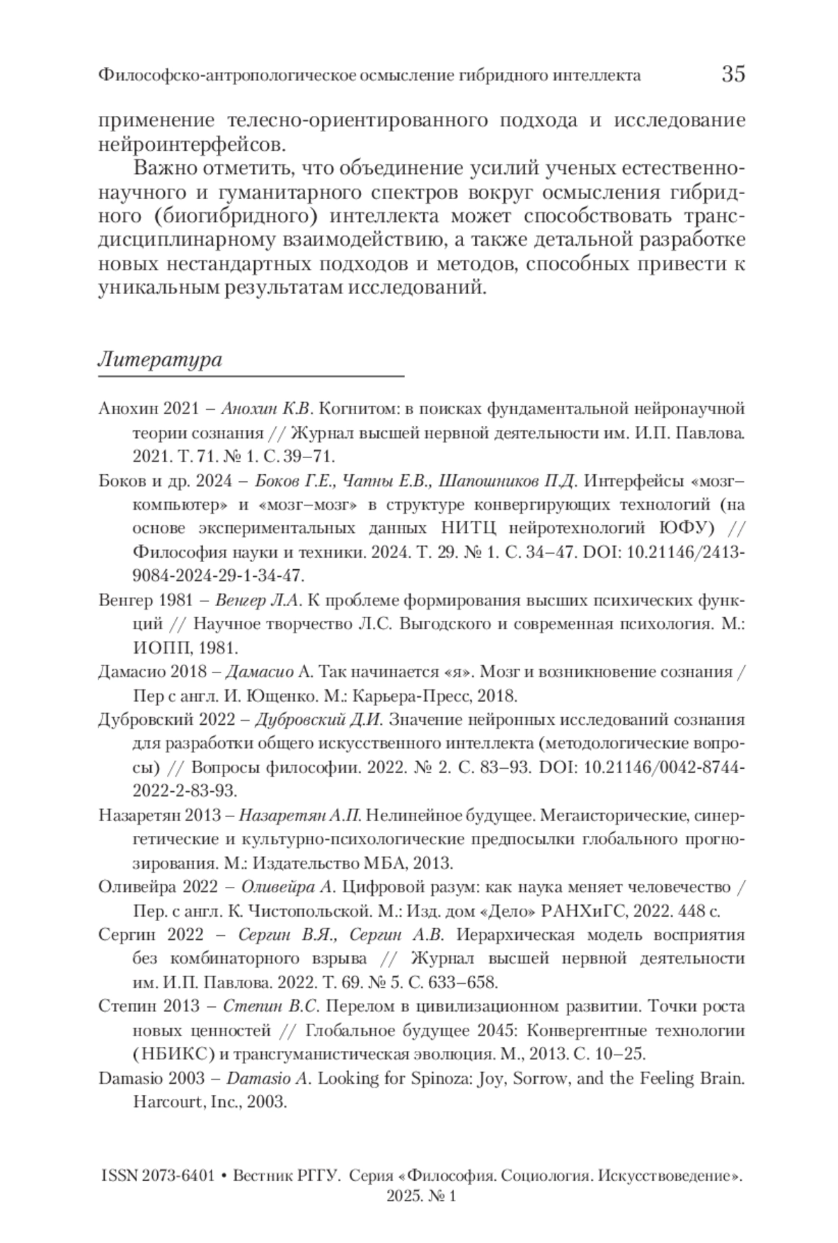 5. Дубровский 2022 - Дубровский Д.И. Значение нейронных исследований сознания для разработки общего искусственного интеллекта (методологические вопросы) // Вопросы философии. 2022. № 2. C. 83-93. https://doi.org/10.21146/0042-8744-2022-2-83-93.