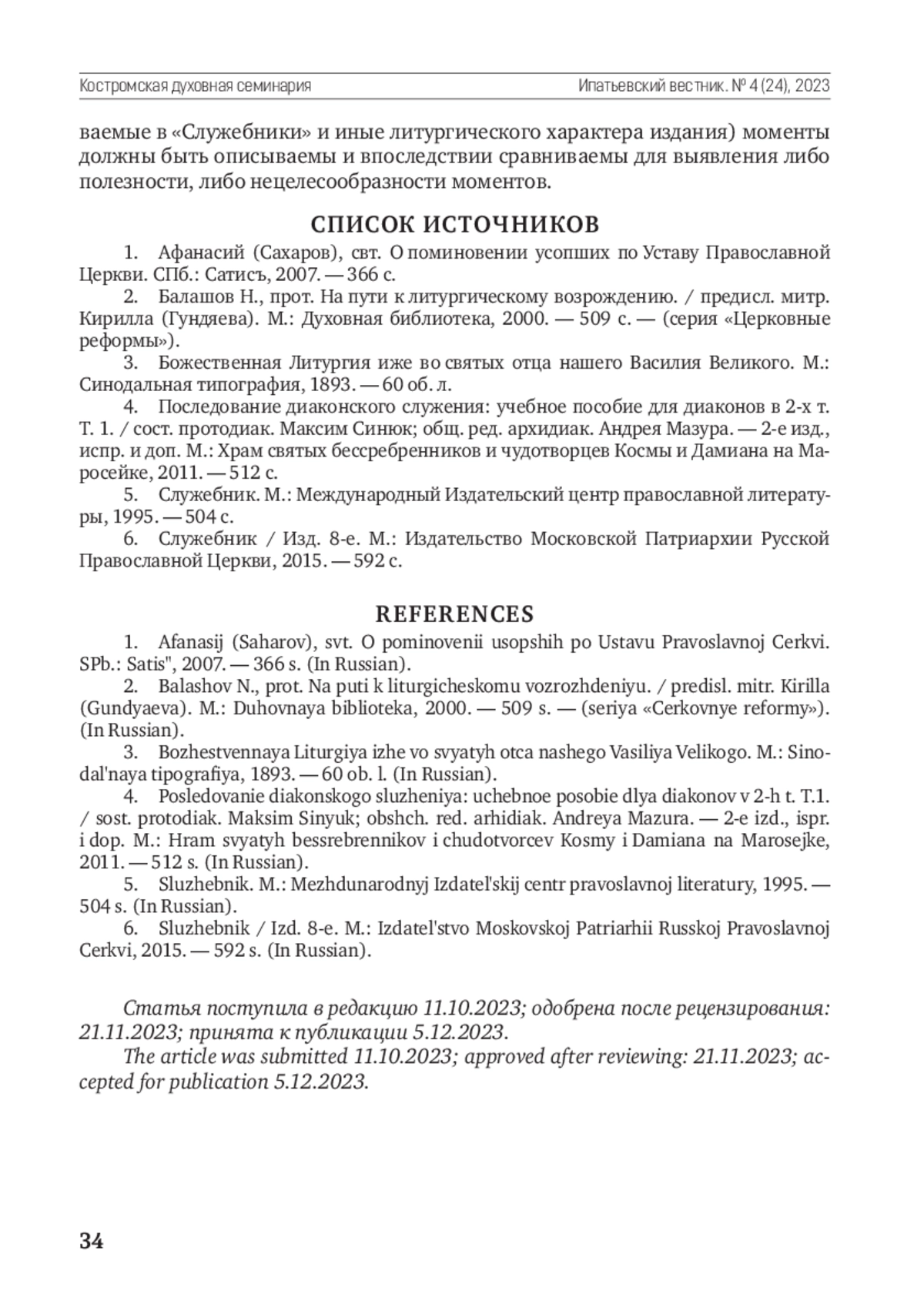 Попов А.Д., диак. Литургические заметки и отдельные прошения “Служебника” в последовании Божественной Литургии: отличие от практики начала XXI столетия // Ипатьевский вестник. - 2023. - №4. - С.25-34.