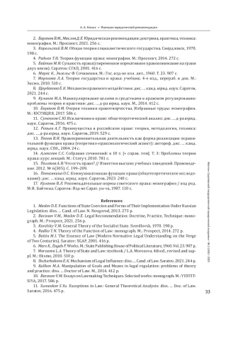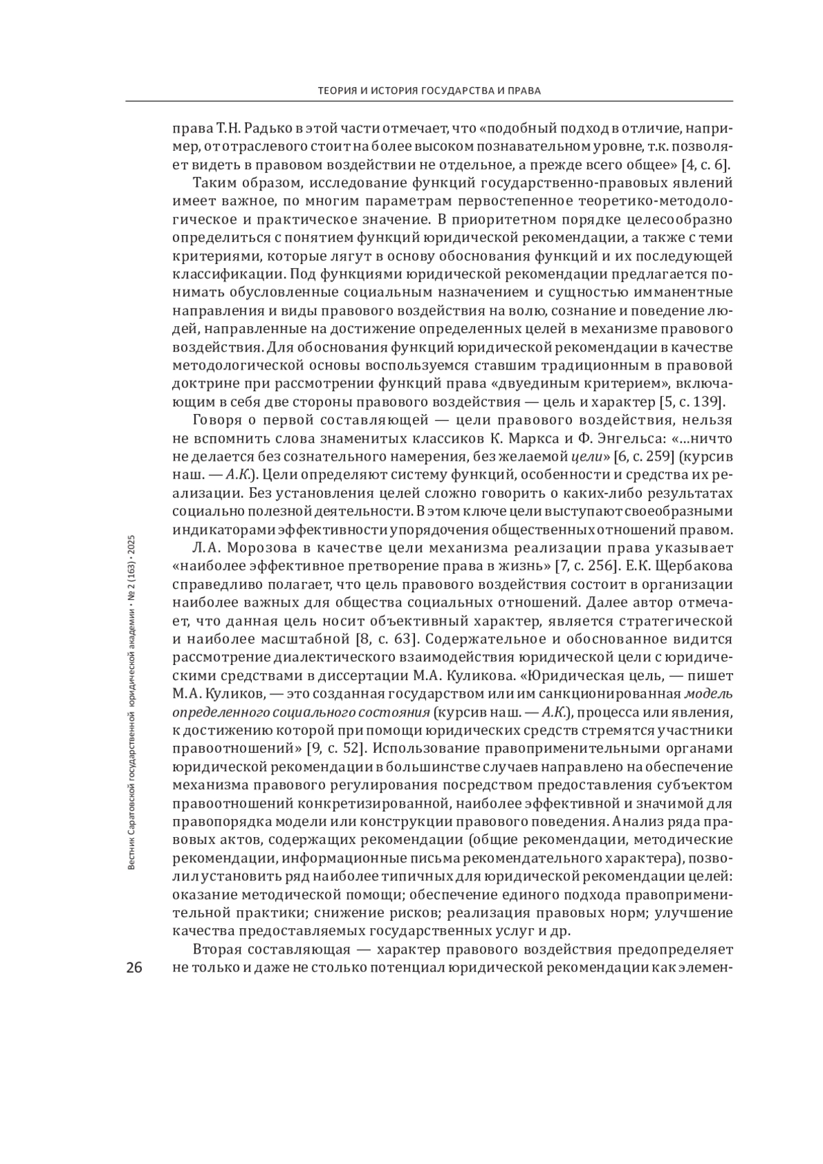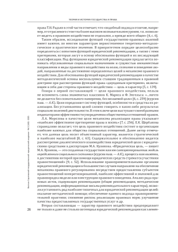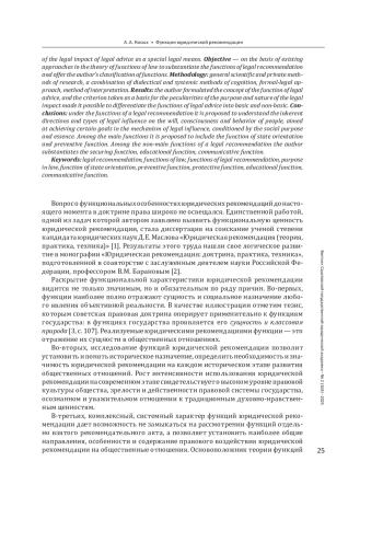 Введение: раскрытие функциональных особенностей юридической рекомендации видится обоснованным по ряду причин. Во-первых, исследование функций позволяет наиболее полно раскрыть сущность и социальное назначение юридической рекомендации, ее роль на каждом историческом этапе развития общества. Во-вторых, комплексный анализ функций юридической рекомендации дает возможность системно оценить функциональные возможности данного правового феномена, выходя за пределы оценки предназначения отдельного рекомендательного акта. В-третьих, исследование функций юридической рекомендации дополняет основные положения теории функций права, акцентируя внимание на особенностях правового воздействия юридической рекомендации как особого правового средства. Цель - на основе существующих подходов в теории функций права обосновать функции юридической рекомендации и предложить авторскую классификацию функций.