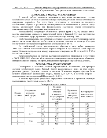 7. Леонтьев С.В., Галкина М.Д. Исследование влияния технологических факторов на процессы формирования структуры неавтоклавного газобетона // Современные технологии в строительстве. Теория и практика. 2021. Т. 1. С. 314-318. EDN: FCKERQ