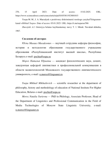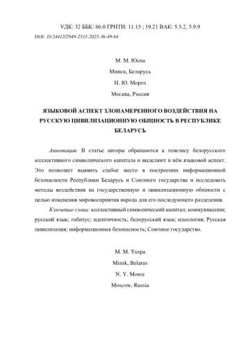 ЮСПА М. М., МОРОЗ Н. Ю. ЯЗЫКОВОЙ АСПЕКТ ЗЛОНАМЕРЕННОГО ВОЗДЕЙСТВИЯ НА РУССКУЮ ЦИВИЛИЗАЦИОННУЮ ОБЩНОСТЬ В РЕСПУБЛИКЕ БЕЛАРУСЬ // РОССИЙСКАЯ ШКОЛА СВЯЗЕЙ С ОБЩЕСТВЕННОСТЬЮ. 2025. № 36
