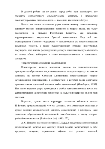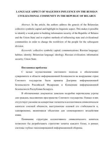 Ключевые фразы: коллективный символический капитал, коммуникации, русский язык, габитус, идентичность, белорусский язык, идеология, русская цивилизация, информационная безопасность, СОЮЗНОЕ ГОСУДАРСТВО