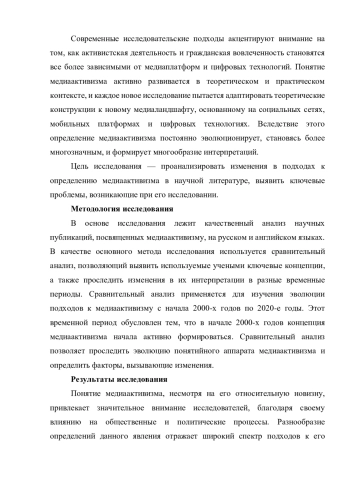 В последние десятилетия концепция медиаактивизма привлекала внимание исследователей и формировала интенсивные дискуссии вокруг данного явления. Вместе с тем, как возникали движения, мобилизующие широкие массы, организовывались крупные протесты, также возникали и исчезали обсуждения медиапрактик, и в итоге активизм стал еще одной актуальной темой научных исследований. Согласно данным ресурса Google BooksNgramViewer, начиная с 1990-х годов, количество упоминаний медиаактивизма в иностранных источниках стремительно растет, и за последние 20 лет оно выросло в 9 раз.