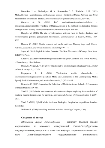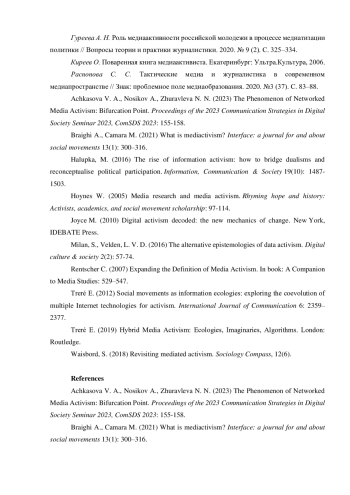 1. Бронников И. А., Горбачев М. В., Кононенко О. С., Тимирчев И. К. Медиаактивизм и гражданская мобилизация: генезис и тенденции //Российский социально-гуманитарный журнал. 2021. №1. С. 44-60.