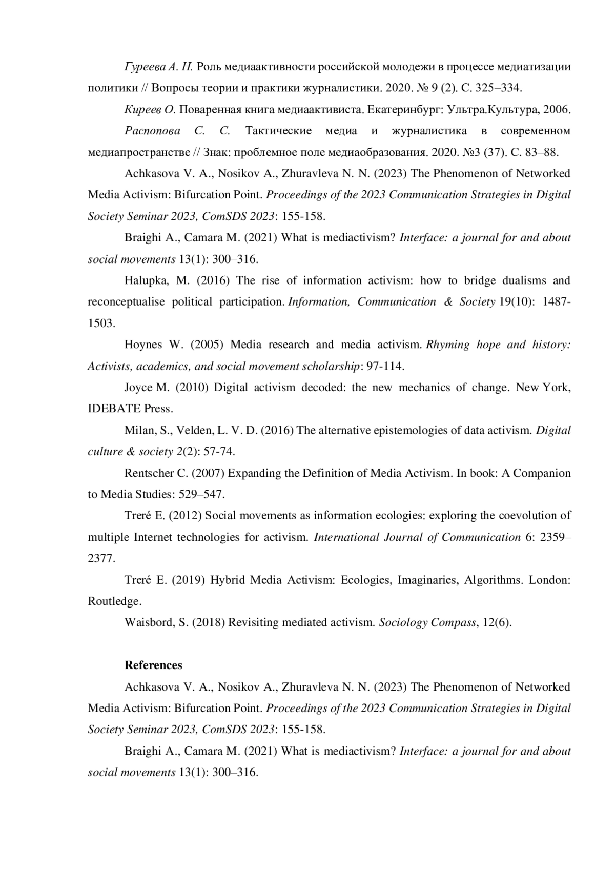 5. Achkasova V. A., Nosikov A., Zhuravleva N. N. (2023) The Phenomenon of Networked Media Activism: Bifurcation Point. Proceedings of the 2023 Communication Strategies in Digital Society Seminar 2023, ComSDS 2023: 155-158.