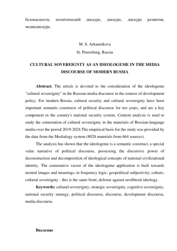 Статья посвящена рассмотрению идеологемы «культурный суверенитет» в российском медиадискурсе в контексте политики развития. Для современной России культурная безопасность и культурный суверенитет уже десять лет являются ведущими смысловыми конструктами политического дискурса, а в системе национальной безопасности страны являются ее ключевым структурным элементом. На материале русскоязычных медиа за 2019—2024 гг. с помощью контент-анализа исследуется коннотация культурного суверенитета. В качестве эмпирической базы проведенного исследования были использованы данные системы «Медиалогия» (8028 материалов из 664 источников).