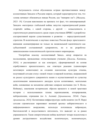 Актуальность статьи обусловлена острым противостоянием между коллективным Западом и Русским миром, который характеризуется тем, что «снова начинает обновляться имидж России, как империи зла» [Минаева, 2023: 19]. Сегодня невозможно не признать тот факт, что инициированный Западом «мегатренд» глобальной войны запустил параметрический режим «горячей» войны, с одной стороны, с другой — осмысленность и стратегическую решительность среди стран-участников БРИКС в разработке альтернативной версии существования и развития — мироустроительной стратегии. В политических и научных повестках России фокус пристального внимания сконцентрирован не только на национальной идентичности как субъективной составляющей суверенитета, но и на разработке цивилизационно-геополитической стратегии нового миропорядка.