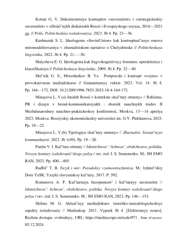 15. Кушнерук С. Л. Идеологема “SovietUnion” как концептуальная основа миромоделирования в журналистском нарративе о Челябинске // Политическая лингвистика. 2022. № 4. С. 21-30.