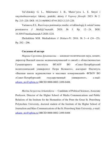 5. Вартанова Е. Л. Развивая понимание медиа: от технологий к социальному пространству // Меди@льманах. 2020. № 5. С. 12-24. DOI: 10.30547/mediaalmanah.5.2020.1224 EDN: SBFTWZ