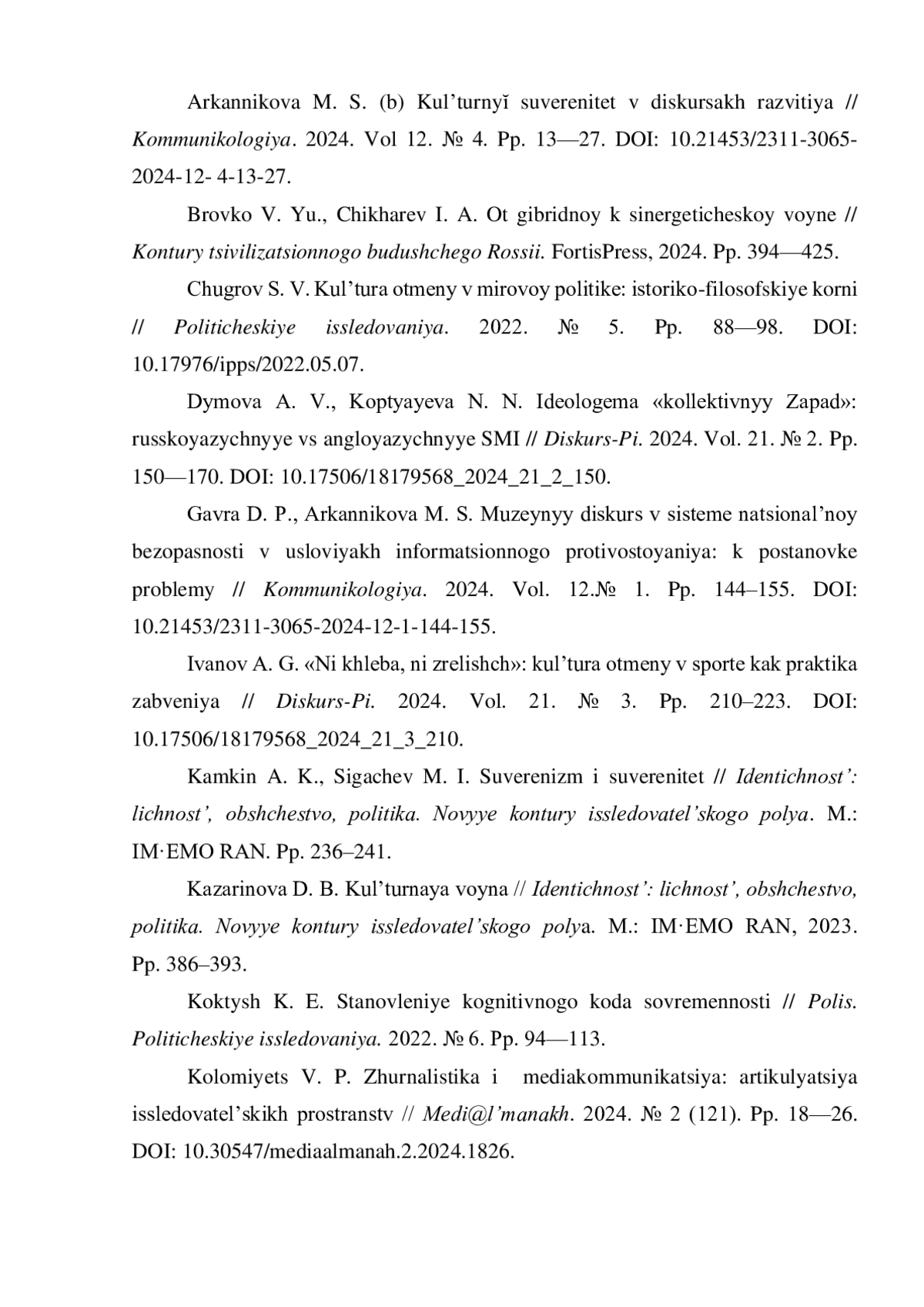 3. Арканникова М. С. (б) Культурный суверенитет в дискурсах развития // Коммуникология. 2024. Том 12. № 4. C. 13-27. 10.21453/2311-3065-2024-12- 4-13-27. DOI: 10.21453/2311-3065-2024-12-4-13-27