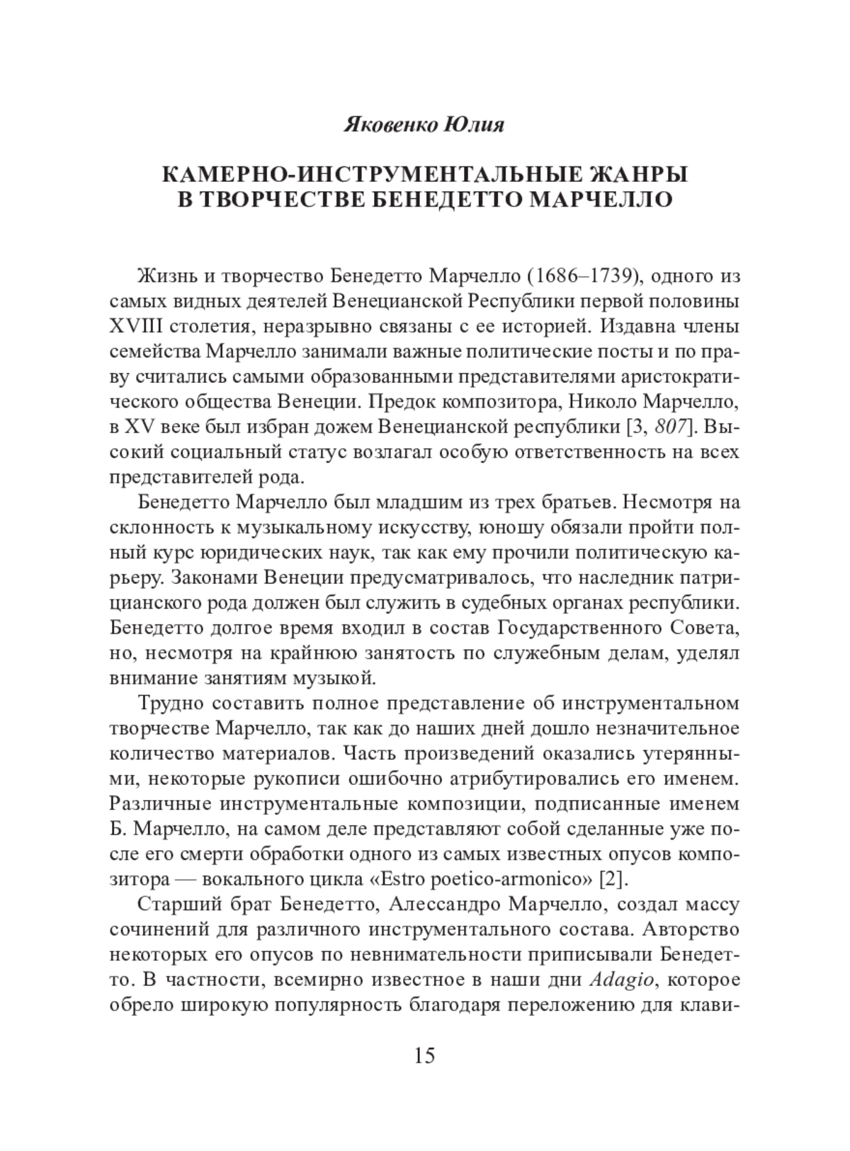 Жизнь и творчество Бенедетто Марчелло (1686–1739), одного из самых видных деятелей Венецианской Республики первой половины XVIII столетия, неразрывно связаны с ее историей. Издавна члены семейства Марчелло занимали важные политические посты и по праву считались самыми образованными представителями аристократического общества Венеции. Предок композитора, Николо Марчелло, в XV веке был избран дожем Венецианской республики [3, 807]. Высокий социальный статус возлагал особую ответственность на всех представителей рода.