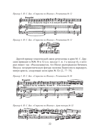 В исследованиях Пассионов И. С. Баха жанру речитатива всегда уделяется меньше внимания, чем другим номерам. На самом деле речитативы выполняют не только важную драматургическую роль, повествуя о событиях. Дж. Гардинер отмечает такие их черты, как «текучесть и драматическая сила партии Евангелиста» [1, 555]. Эту же мысль развивает и М. С. Друскин, объясняя ее тем, что «Бах вовсе не стремится к эпическому рассказу, он воспринимает Евангелиста как очевидца, который не может спокойно говорить о произошедшей драме, чему свидетелем был» [2, 54–55].