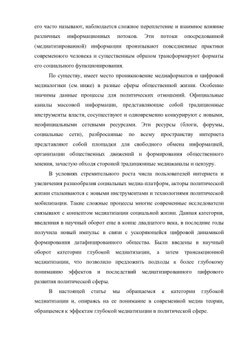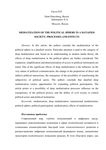 В настоящей статье авторы рассматривают медиатизацию политической сферы в датафицированном социуме. Особое внимание обращается на категорию глубокой медиатизации. Опираясь на ее понимание в современной медиа теории, авторы рассматривают эффекты глубокой медиатизации в политической сфере. Отмечается расширение, упрощение и демократизация доступа к политической информации. Одним из значимых эффектов глубокой медиатизации является ее влияние на сам характер политической коммуникации, изменение удельных весов прямых и опосредованных политических взаимодействий, появление возможности трансформации субъектности политических акторов. Авторы приходят к выводу, что датафицированная глубокая медиатизация создает возможности расширения политического участия. Отмечается возможность влияния процессов глубокой медиатизации на прозрачность политического процесса и возможность гражданского общества контролировать политических акторов и политические институты.