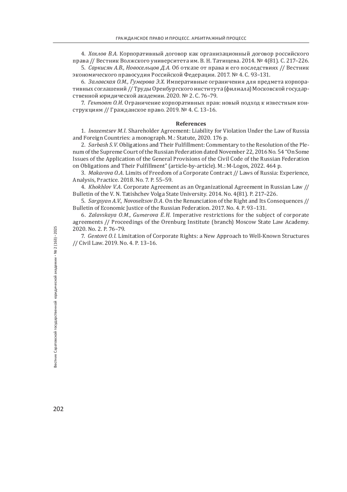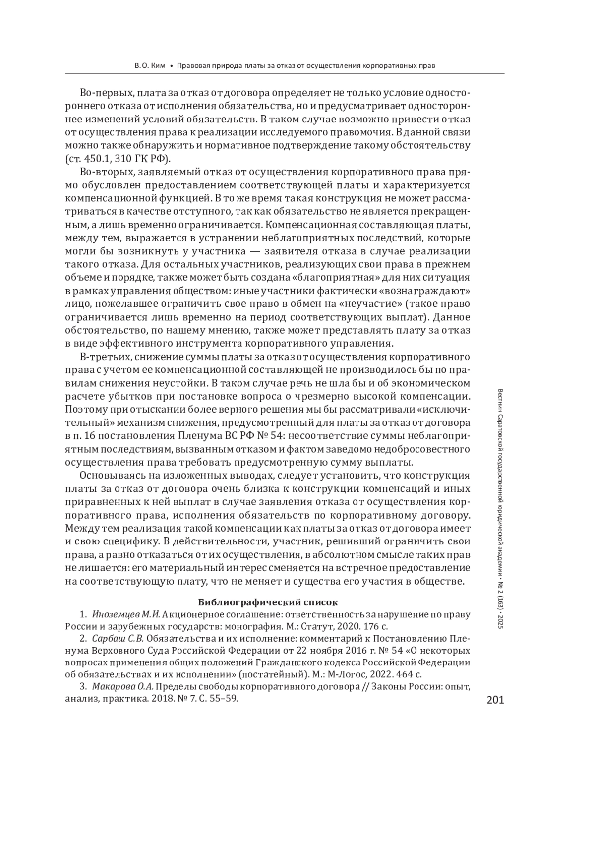 КИМ В. О. ПРАВОВАЯ ПРИРОДА ПЛАТЫ ЗА ОТКАЗОТ ОСУЩЕСТВЛЕНИЯ КОРПОРАТИВНЫХ ПРАВ // ВЕСТНИК САРАТОВСКОЙ ГОСУДАРСТВЕННОЙ ЮРИДИЧЕСКОЙ АКАДЕМИИ. 2025. № 2 (163)