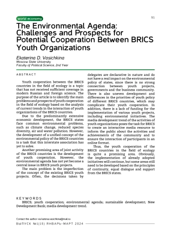 Молодежное сотрудничество стран БРИКС в сфере экологии — тема, не получившая достаточного освещения в современной российской и зарубежной науке. Целью данной статьи является выявление основных проблем и перспектив молодежного сотрудничества в сфере экологии на основе общей характеристики этого сотрудничества и анализа современных тенденций взаимодействия молодежных организаций стран БРИКС.