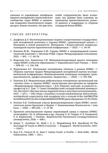 Таким образом, молодежное сотрудничество стран БРИКС в экологической сфере является достаточно перспективным направлением, которое необходимо развивать, основываясь на принципах преемственности, равного диалога и поддержки со стороны государств блока БРИКС.