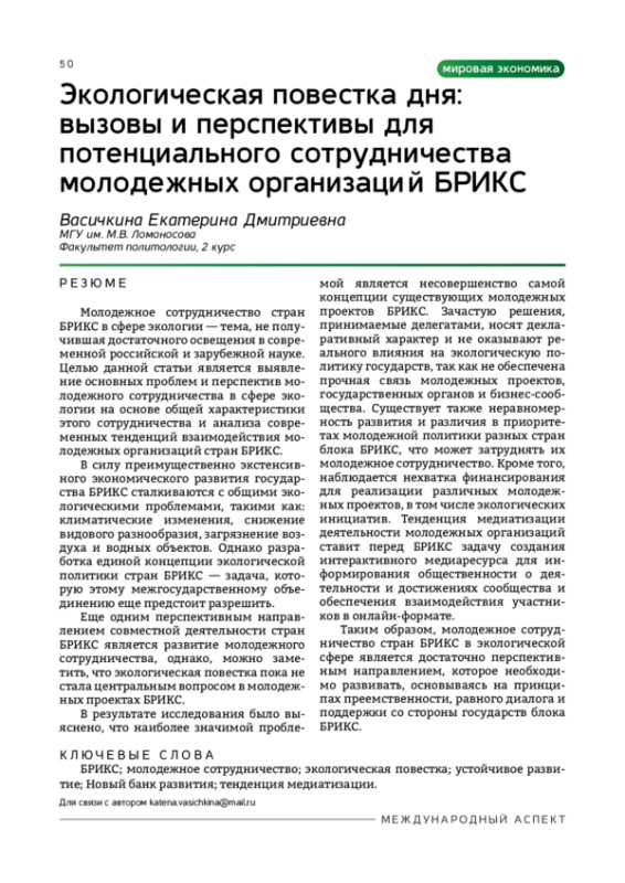 Еще одним перспективным направлением совместной деятельности стран БРИКС является развитие молодежного сотрудничества, однако, можно заметить, что экологическая повестка пока не стала центральным вопросом в молодежных проектах БРИКС.