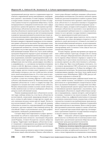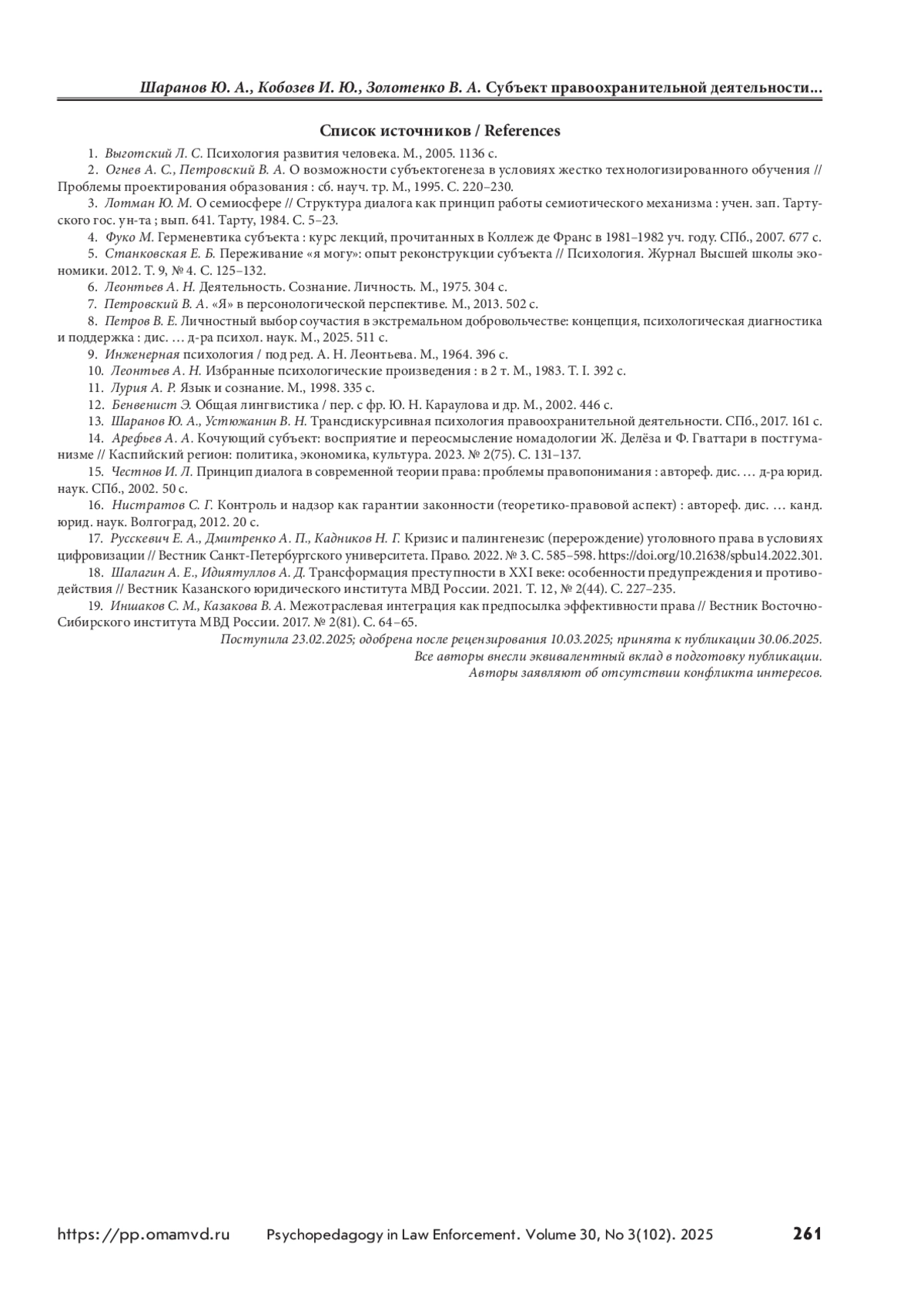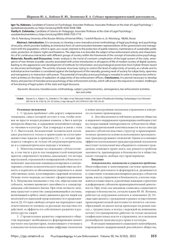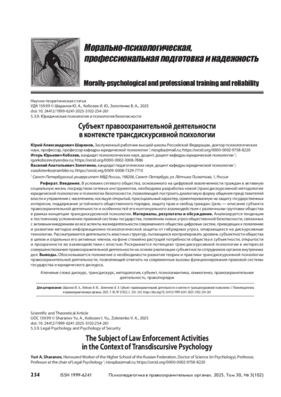 В условиях сетевого общества, основанного на цифровой вовлеченности граждан в активную социальную жизнь посредством сетевых инструментов, необходима разработка новой (трансдискурсивной) методологии юридической психологии и психологии безопасности, позволяющей построить диалоговую форму общения представителей власти и управления с населением, носящую открытый, просоциальный характер, ориентированную на защиту государственных интересов, поддержание устойчивого общественного порядка, защиту прав и свобод граждан. Цель — описание субъекта правоохранительной деятельности и особенностей его континуального взаимодействия с различными группами общества в рамках концепции трансдискурсивной психологии. Материалы, результаты и обсуждение. Анализируется тенденция к постоянному усложнению правовой системы государства, появлению новых угроз общественной безопасности, связанных с активным внедрением во все аспекты жизнедеятельности современного общества цифровых систем, приводящих к появлению и развитию методов информационно-психологической защиты от гибридных угроз, опирающихся на дискурсивные технологии. Рассматривается деятельность властных структур, пытающихся контролировать уровень субъектности общества в целом и отдельных его активных членов, на фоне стихийно растущей потребности общества в субъектности, открытости и прозрачности во взаимодействии с властью. Раскрывается потенциал трансдискурсивной психологии в интересах совершенствования правоохранительной деятельности на основе реализации субъектности сотрудников органов внутренних дел. Выводы. Обосновывается положение о необходимости развития теории и практики трансдискурсивной психологии правоохранительной деятельности, позволяющей отвечать на современные вызовы функционирования правовой системы государства и юридического дискурса.
