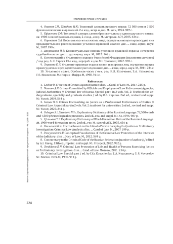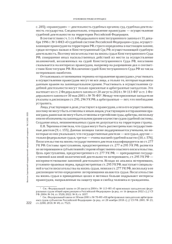 Выводы: сформулированы предложения по совершенствованию УК РФ: в ст. 295, 296, 297, 298.1 вместо иных лиц, участвующих в отправлении правосудия, указать арбитражных заседателей; в примечании к ст. 305 УК РФ представить дефиницию термина «неправосудный судебный акт», который не соответствует нормам материального и процессуального права и фактическим обстоятельствам дела.