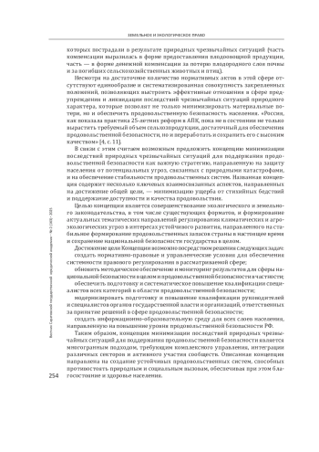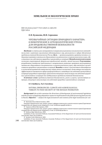 Введение: в статье рассматриваются направления развития экологического законодательства и практики применения адаптационных мер, реализуемых в сфере обеспечения продовольственной безопасности России. Цель - проанализировать правовые основы и содержание правового механизма сдерживания климатических и агроэкологических угроз, обусловленных последствиями природных чрезвычайных ситуаций.