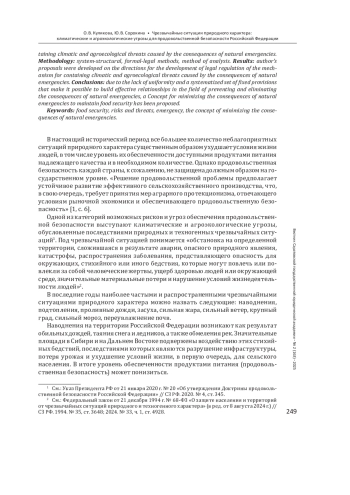 Выводы: в связи с отсутствием единообразия и систематизированной совокупности закрепленных положений, позволяющих выстроить эффективные отношения в сфере предупреждения и ликвидации последствий чрезвычайных ситуаций природного характера, предложена концепция минимизации последствий природных чрезвычайных ситуаций для поддержания продовольственной безопасности.