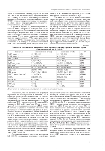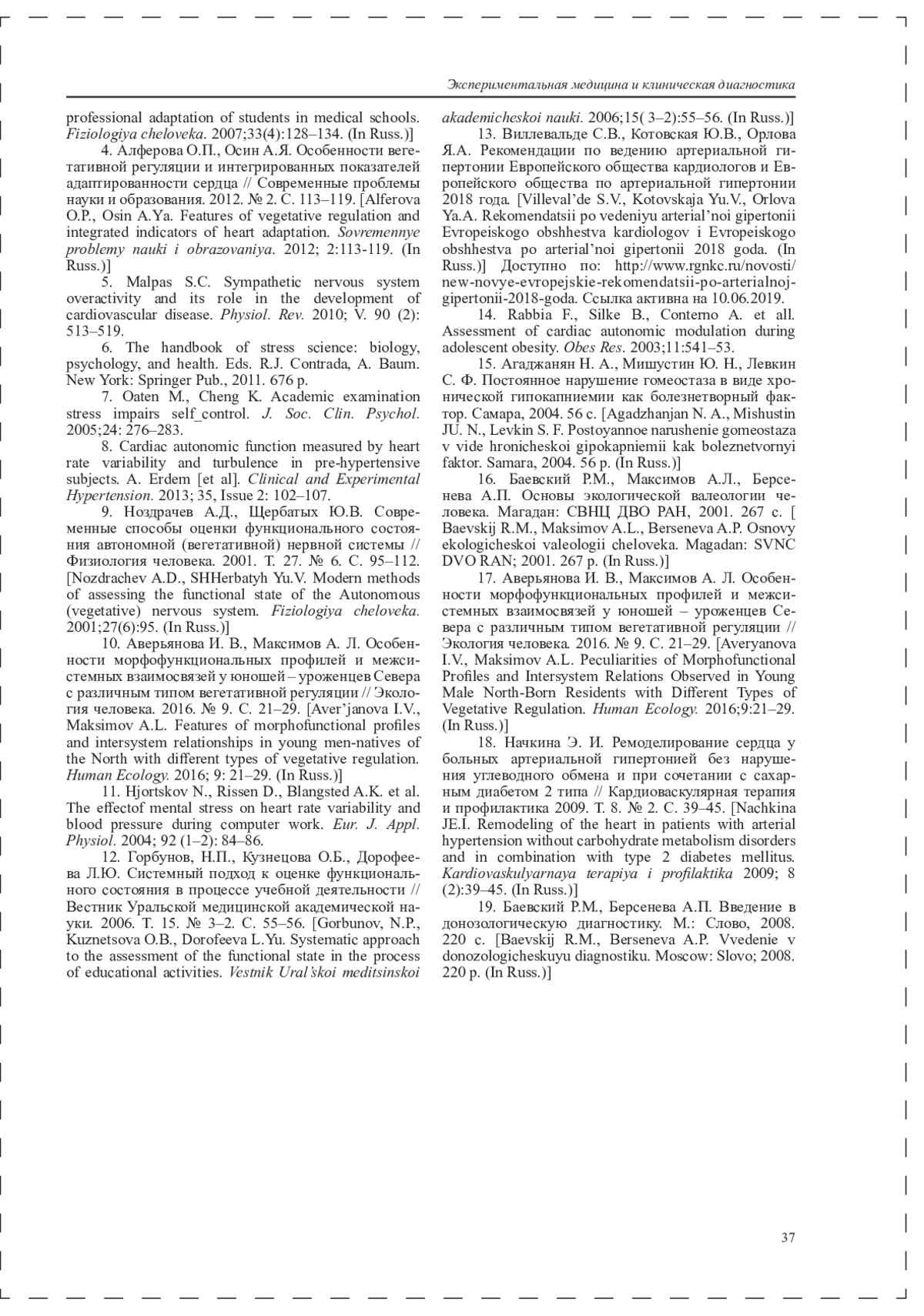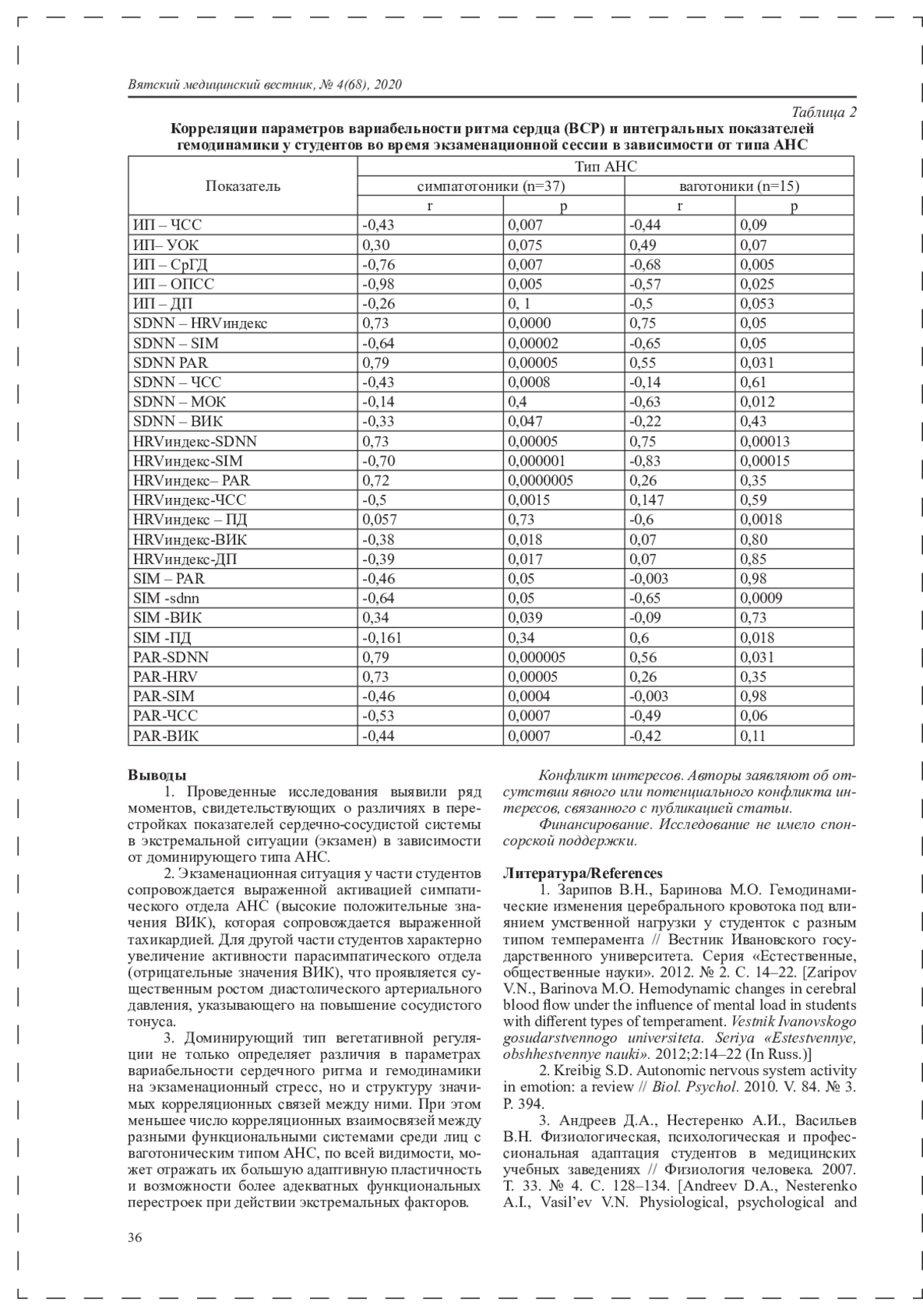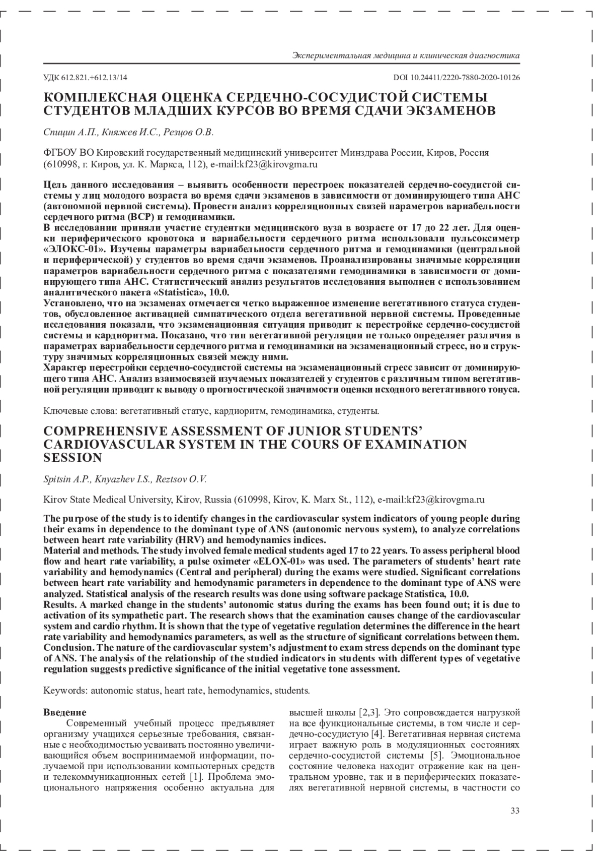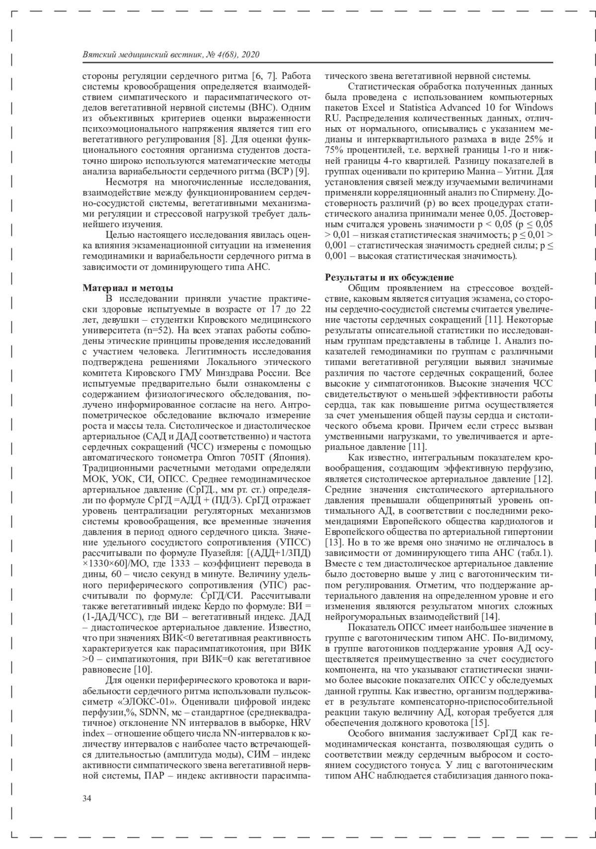 Введение Современный учебный процесс предъявляет организму учащихся серьезные требования, связанные с необходимостью усваивать постоянно увеличивающийся объем воспринимаемой информации, получаемой при использовании компьютерных средств и телекоммуникационных сетей [1]. Проблема эмоционального напряжения особенно актуальна для высшей школы [2,3]. Это сопровождается нагрузкой на все функциональные системы, в том числе и сердечно-сосудистую [4]. Вегетативная нервная система играет важную роль в модуляционных состояниях сердечно-сосудистой системы [5]. Эмоциональное состояние человека находит отражение как на центральном уровне, так и в периферических показателях вегетативной нервной системы, в частности со 34 Вятский медицинский вестник, № 4(68), 2020 стороны регуляции сердечного ритма [6, 7]. Работа системы кровообращения определяется взаимодействием симпатического и парасимпатического отделов вегетативной нервной системы (ВНС). Одним из объективных критериев оценки выраженности психоэмоционального напряжения является тип его вегетативного регулирования [8]. Для оценки функционального состояния организма студентов достаточно широко используются математические методы анализа вариабельности сердечного ритма (ВСР) [9]. Несмотря на многочисленные исследования, взаимодействие между функционированием сердечно-сосудистой системы, вегетативными механизмами регуляции и стрессовой нагрузкой требует дальнейшего изучения. Целью настоящего исследования явилась оценка влияния экзаменационной ситуации на изменения гемодинамики и вариабельности сердечного ритма в зависимости от доминирующего типа АНС. Материал и методы В исследовании приняли участие практически здоровые испытуемые в возрасте от 17 до 22 лет, девушки – студентки Кировского медицинского университета (n=52). На всех этапах работы соблюдены этические принципы проведения исследований с участием человека. Легитимность исследования подтверждена решениями Локального этического комитета Кировского ГМУ Минздрава России. Все испытуемые предварительно были ознакомлены с содержанием физиологического обследования, получено информированное согласие на него. Антропометрическое обследование включало измерение роста и массы тела. Систолическое и диастолическое артериальное (САД и ДАД соответственно) и частота сердечных сокращений (ЧСС) измерены с помощью автоматического тонометра Оmron 705IT (Япония). Традиционными расчетными методами определяли МОК, УОК, СИ, ОПСС. Среднее гемодинамическое артериальное давление (СрГД., мм рт. ст.) определяли по формуле СрГД =АДД + (ПД/3). СрГД отражает уровень централизации регуляторных механизмов системы кровообращения, все временные значения давления в период одного сердечного цикла. Значение удельного сосудистого сопротивления (УПСС) рассчитывали по формуле Пуазейля: [(АДД+1/3ПД) ×1330×60]/МО, где 1333 – коэффициент перевода в дины, 60 – число секунд в минуте. Величину удельного периферического сопротивления (УПС) рассчитывали по формуле: СрГД/СИ. Рассчитывали также вегетативный индекс Кердо по формуле: ВИ = (1-ДАД/ЧСС), где ВИ – вегетативный индекс. ДАД – диастолическое артериальное давление. Известно, что при значениях ВИК<0 вегетативная реактивность характеризуется как парасимпатикотония, при ВИК >0 – симпатикотония, при ВИК=0 как вегетат
