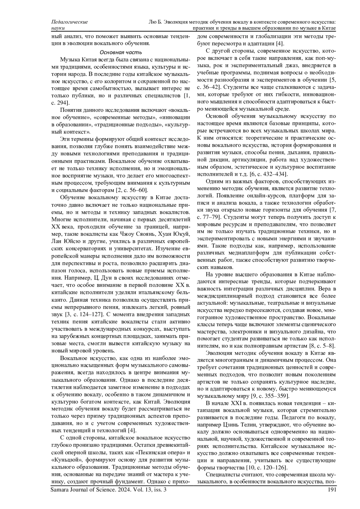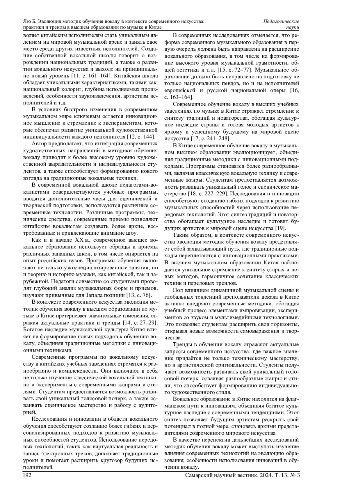 ЛЮ Б. ЭВОЛЮЦИЯ МЕТОДИК ОБУЧЕНИЯ ВОКАЛУ В КОНТЕКСТЕ СОВРЕМЕННОГО ИСКУССТВА: ПРАКТИКИ И ТРЕНДЫ В ВЫСШЕМ ОБРАЗОВАНИИ ПО МУЗЫКЕ В КИТАЕ // САМАРСКИЙ НАУЧНЫЙ ВЕСТНИК. 2024. ТОМ 13, № 3