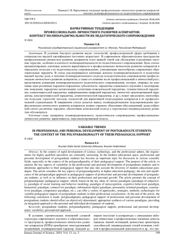 В условиях быстрого развития науки, технологий, профессиональной сферы требования к специалистам высшей квалификации постоянно возрастают. В современном образовательном пространстве профессионально-личностное развитие аспирантов стало важной темой для обсуждения в различных научных отраслях, особенно в контексте полипарадигмальности их педагогического сопровождения. Цель статьи: проанализировать ключевые аспекты вариативности в профессионально-личностном развитии аспирантов и определить подходы к их педагогическому сопровождению, учитывающие многообразие современных образовательных парадигм. В статье рассматриваются ключевые аспекты полипарадигмальности в педагогике высшей школы; роль и значение полипарадигмального подхода в педагогическом сопровождении профессионально-личностного развития аспирантов, а также его влияние на их профессиональный и личностный рост; представлена концепция полипарадигмального педагогического сопровождения, которое, опираясь на ключевые идеи различных парадигм (парадигмы субъектности, парадигмы социального научения и моделирование поведения; парадигмы метапознания; когнитивно-поведенческой парадигмы, гуманистической парадигмы, коннективистской парадигмы; информационно-цифровой парадигмы; личностно ориентированной парадигмы, конструктивистской парадигмы, компетентностной парадигмы, и др.), может предложить многообразие подходов, стратегий, методов, технологий для вариативной педподдержки аспирантов в их профессиональной социализации. В завершении статьи делается вывод: полипарадигмальное педсопровождение профессионально-личностного развития аспирантов должно отражать объективно-обусловленный, целесообразный синтез различных парадигм, обеспечивая комплексный подход к персонально-индивидуальному развитию обучающихся.