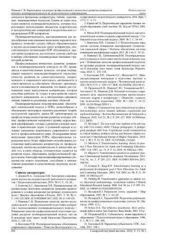 8. Пивнева С.В., Гребенникова В.М. Полипарадигмальность в процессе подготовки научно-педагогических кадров // Повышение качества профессиональной подготовки трудовых ресурсов: полипарадигмальный подход: мат-лы II междунар. науч.-практ. конф. Краснодар: Перспектива, 2024. С. 135-138. EDN: POTEZU