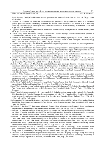 11. Берлизов Н.Е., Винидиктов А.П., Пьянков А.В., Зеленский Ю.В. Статистический анализ погребальных памятников сарматского времени - эпохи средневековья. Часть I. Памятники сарматского времени. Краснодар: КГИАМЗ. 2003. 182 с.
