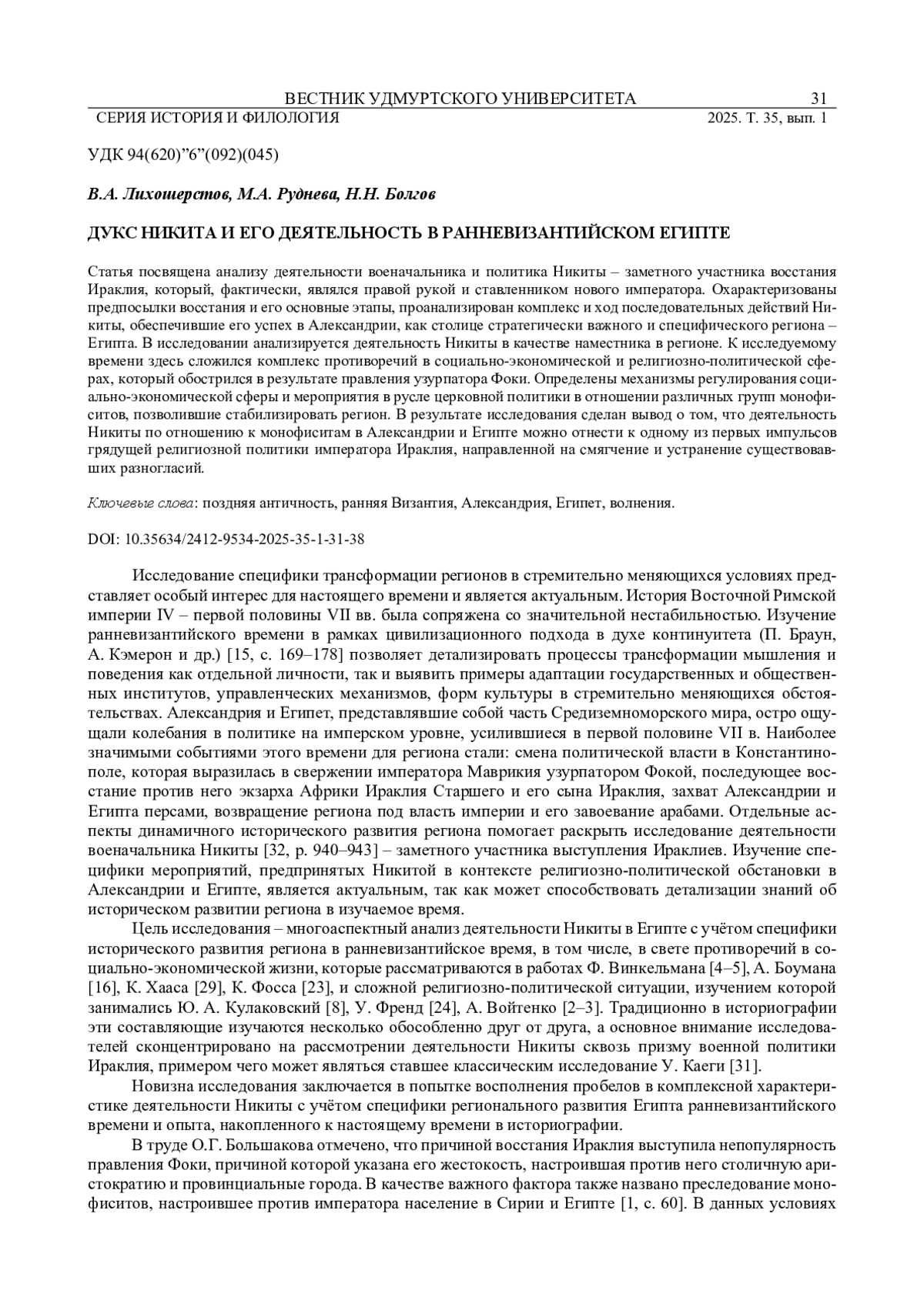 Статья посвящена анализу деятельности военачальника и политика Никиты - заметного участника восстания Ираклия, который, фактически, являлся правой рукой и ставленником нового императора. Охарактеризованы предпосылки восстания и его основные этапы, проанализирован комплекс и ход последовательных действий Никиты, обеспечившие его успех в Александрии, как столице стратегически важного и специфического региона - Египта. В исследовании анализируется деятельность Никиты в качестве наместника в регионе. К исследуемому времени здесь сложился комплекс противоречий в социально-экономической и религиозно-политической сферах, который обострился в результате правления узурпатора Фоки. Определены механизмы регулирования социально-экономической сферы и мероприятия в русле церковной политики в отношении различных групп монофиситов, позволившие стабилизировать регион. В результате исследования сделан вывод о том, что деятельность Никиты по отношению к монофиситам в Александрии и Египте можно отнести к одному из первых импульсов грядущей религиозной политики императора Ираклия, направленной на смягчение и устранение существовавших разногласий.
