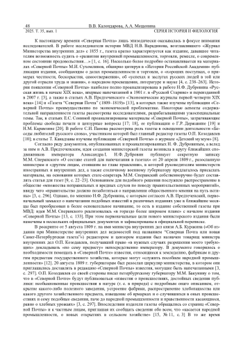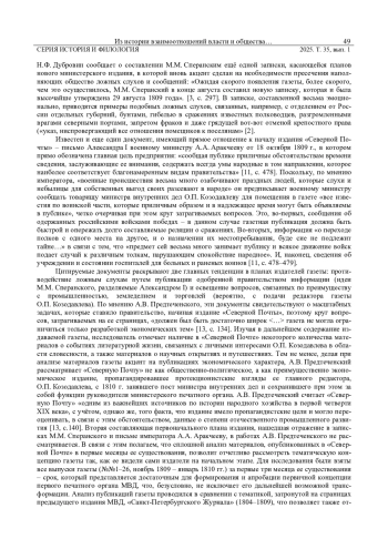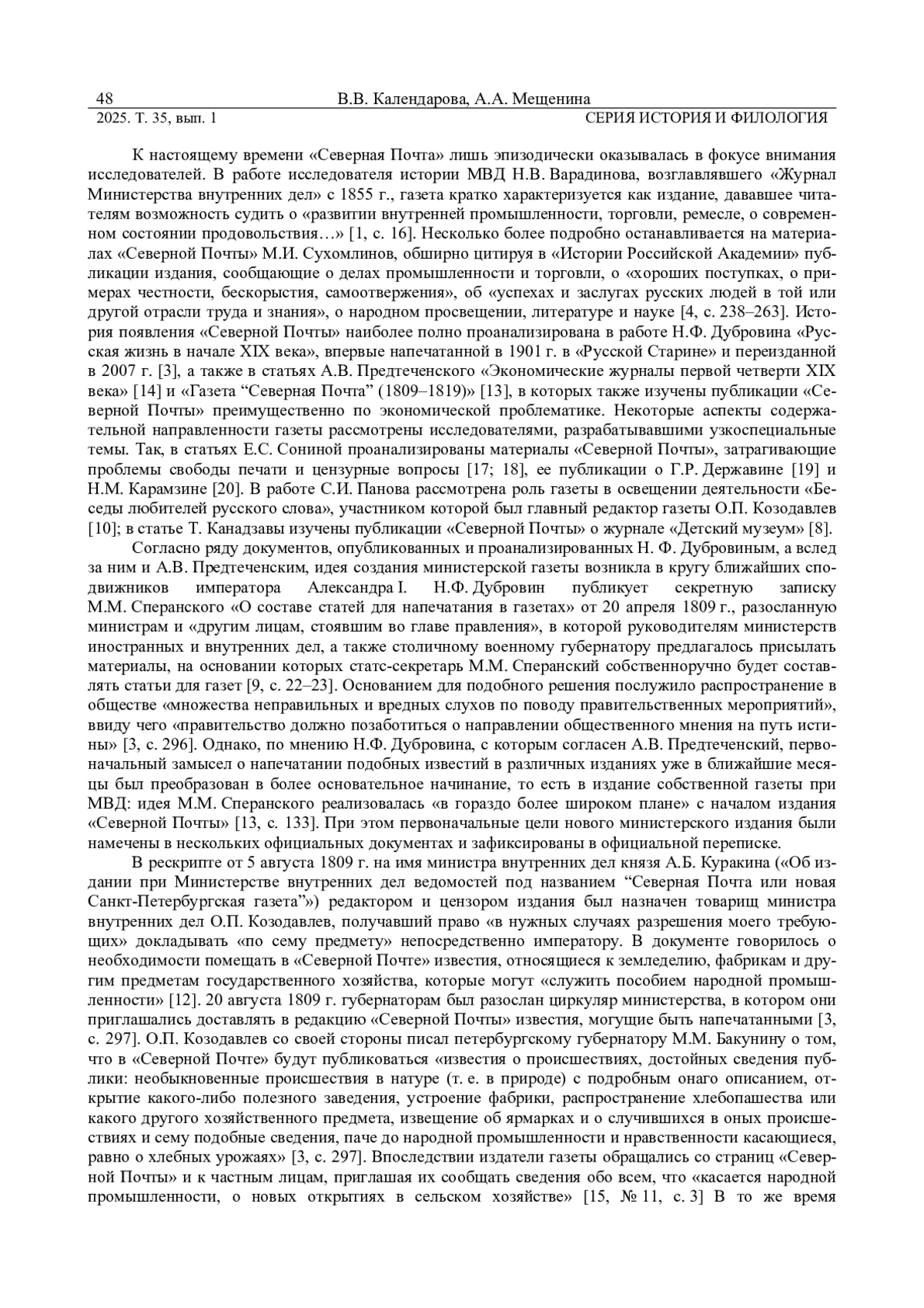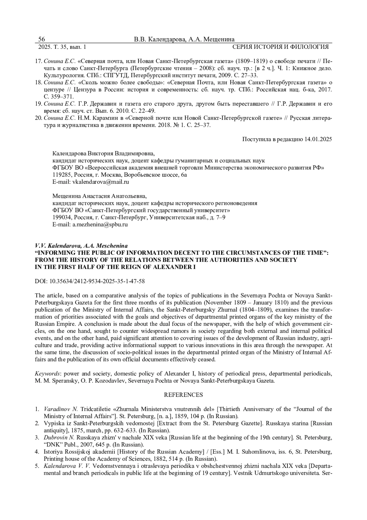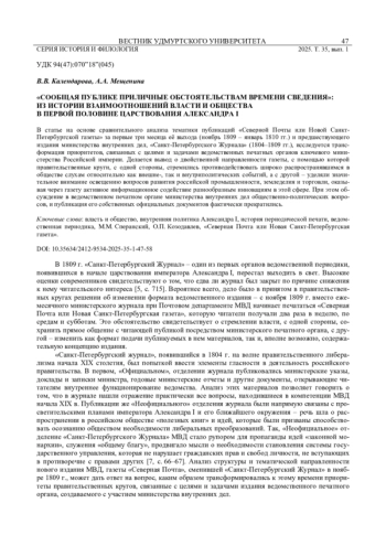 КАЛЕНДАРОВА В. В., МЕЩЕНИНА А. А. «СООБЩАЯ ПУБЛИКЕ ПРИЛИЧНЫЕ ОБСТОЯТЕЛЬСТВАМ ВРЕМЕНИ СВЕДЕНИЯ»: ИЗ ИСТОРИИ ВЗАИМООТНОШЕНИЙ ВЛАСТИ И ОБЩЕСТВА В ПЕРВОЙ ПОЛОВИНЕ ЦАРСТВОВАНИЯ АЛЕКСАНДРА I // ВЕСТНИК УДМУРТСКОГО УНИВЕРСИТЕТА. СЕРИЯ: ИСТОРИЯ И ФИЛОЛОГИЯ. 2025. Т. 35 № 1