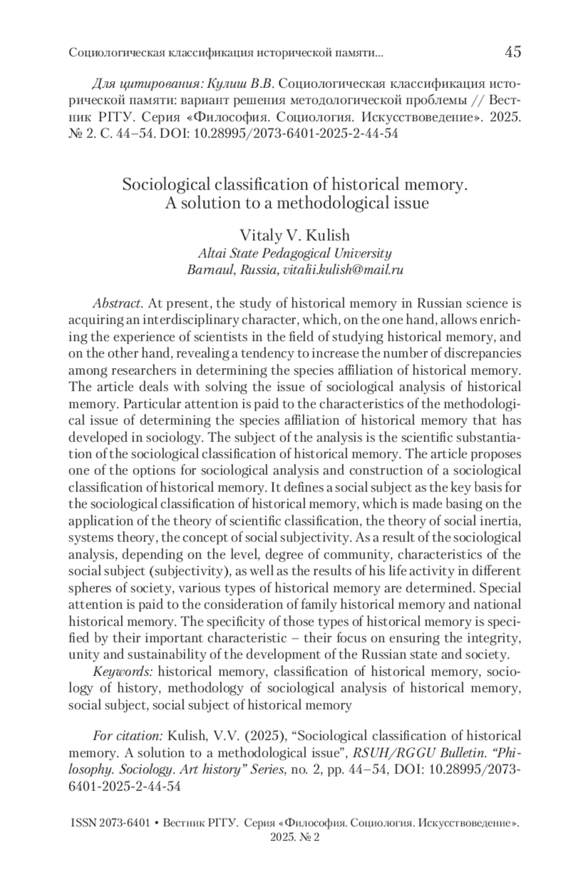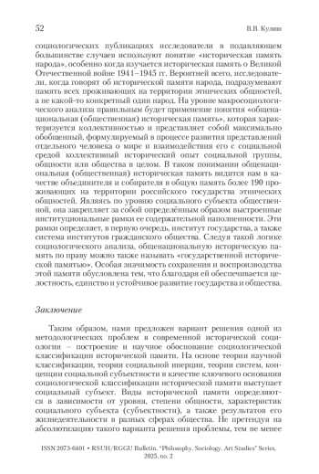В настоящее время исследование исторической памяти в отечественной науке приобретает междисциплинарный характер, что, с одной стороны, позволяет обогатить опыт ученых в области изучения исторической памяти, с другой стороны, выявить тенденцию увеличения количества разночтений исследователей в определении видовой принадлежности исторической памяти. Статья посвящена решению проблемы социологического анализа исторической памяти. Особое внимание уделяется характеристике сложившейся в социологии методологической проблеме определения видовой принадлежности исторической памяти. Предметом анализа выступает научное обоснование социологической классификации исторической памяти. Предлагается один из вариантов социологического анализа и построения социологической классификации исторической памяти. В статье на основе применения теории научной классификации, теории социальной инерции, теории систем, концепции социальной субъектности в качестве ключевого основания социологической классификации исторической памяти определяется социальный субъект. В результате проведенного социологического анализа в зависимости от уровня, степени общности, характеристик социального субъекта (субъектности), а также результатов его жизнедеятельности в разных сферах общества определяются разные виды исторической памяти. Отдельное внимание уделяется рассмотрению семейной исторической памяти и общенациональной исторической памяти. Специфичность этих видов исторической памяти определена их важной характеристикой – направленность на обеспечение целостности, единства и устойчивости развития российского государства и общества.