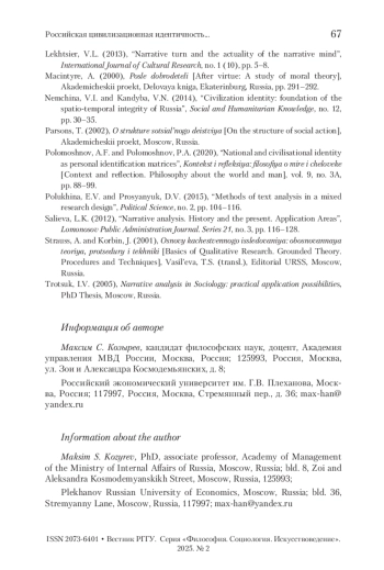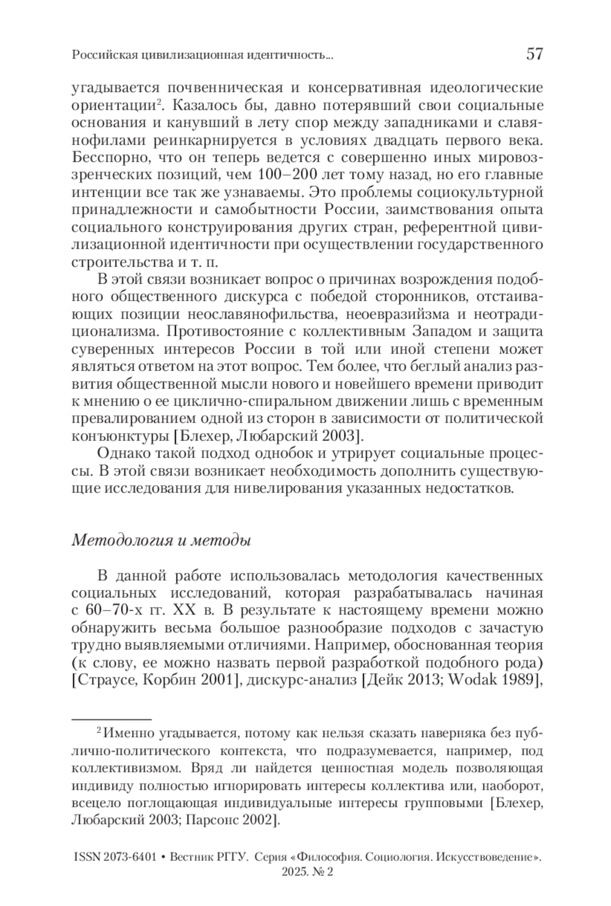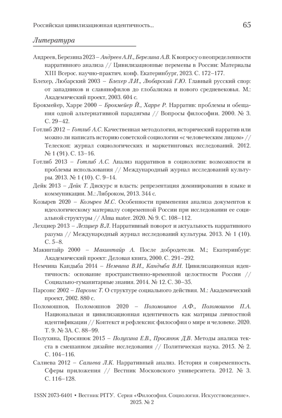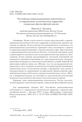 КОЗЫРЕВ М. С. РОССИЙСКАЯ ЦИВИЛИЗАЦИОННАЯ ИДЕНТИЧНОСТЬ В СОВРЕМЕННОМ ПОЛИТИЧЕСКОМ НАРРАТИВЕ: СОЦИАЛЬНО-ФИЛОСОФСКИЙ АНАЛИЗ // ВЕСТНИК РГГУ. СЕРИЯ: ФИЛОСОФИЯ. СОЦИОЛОГИЯ. ИСКУССТВОВЕДЕНИЕ. 2025. № 2