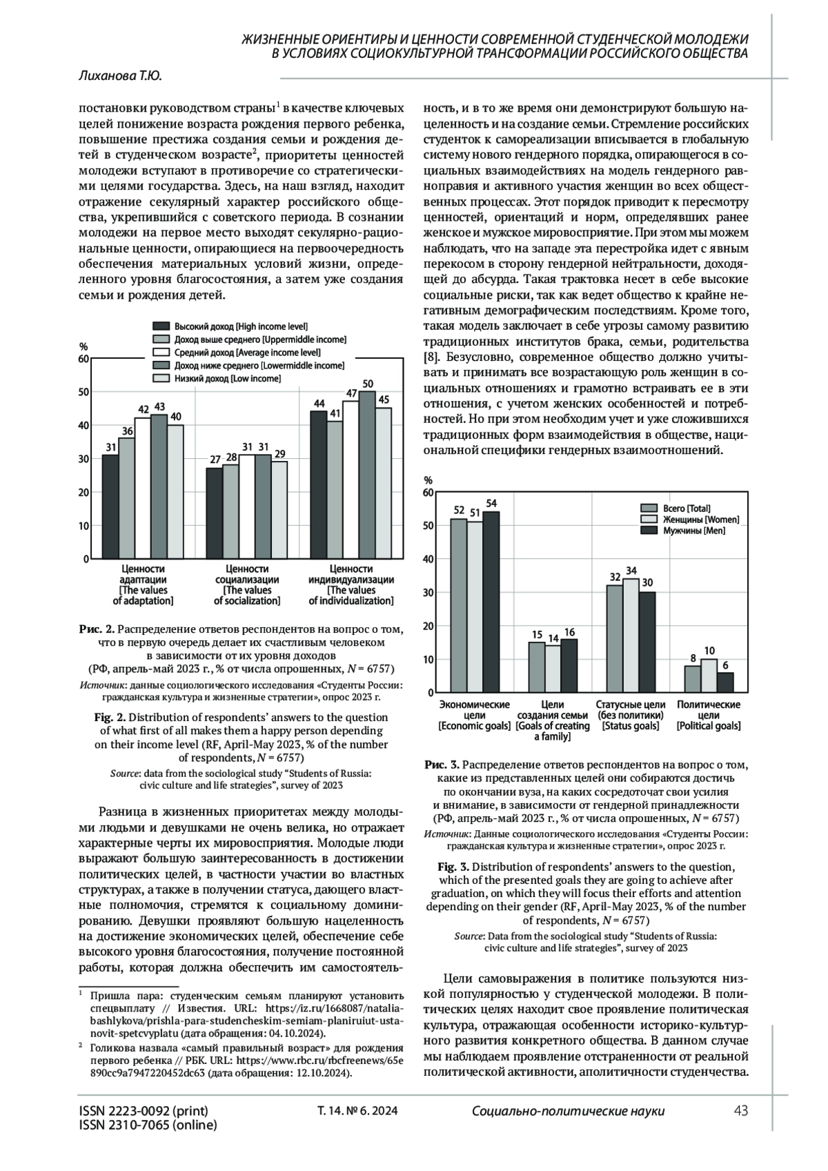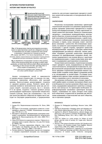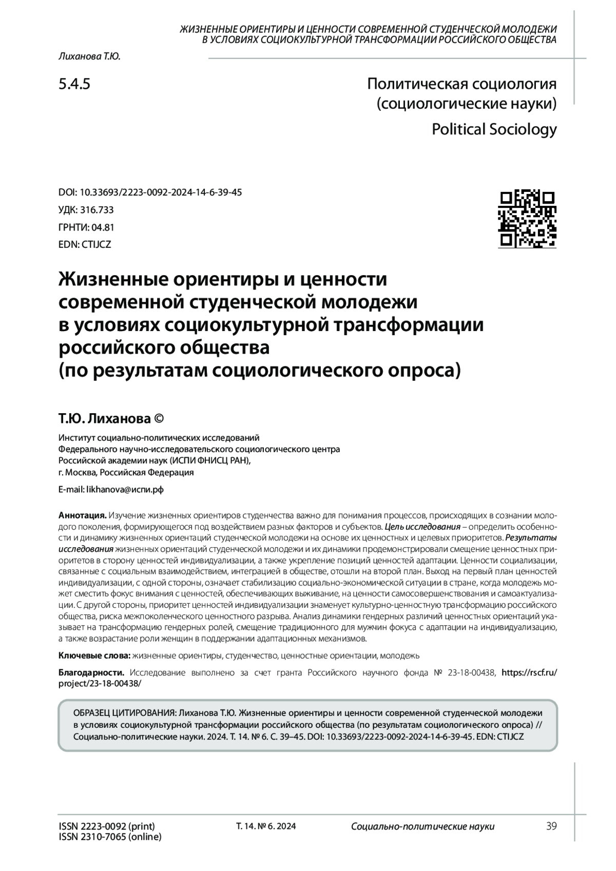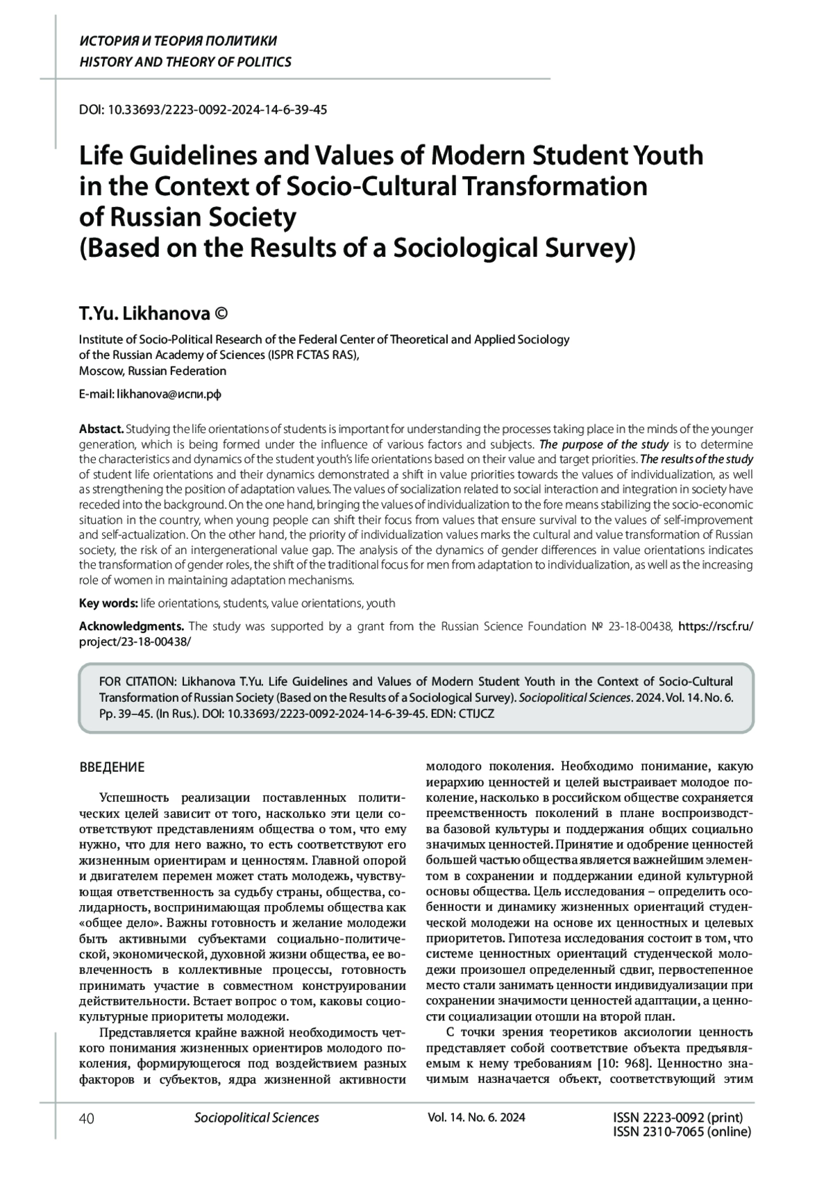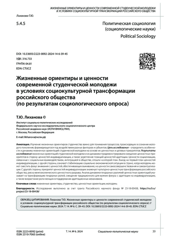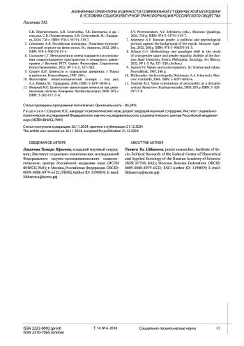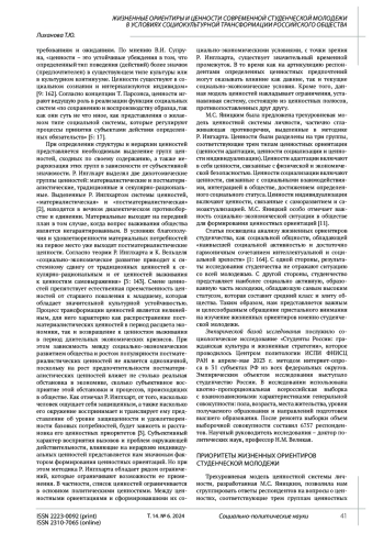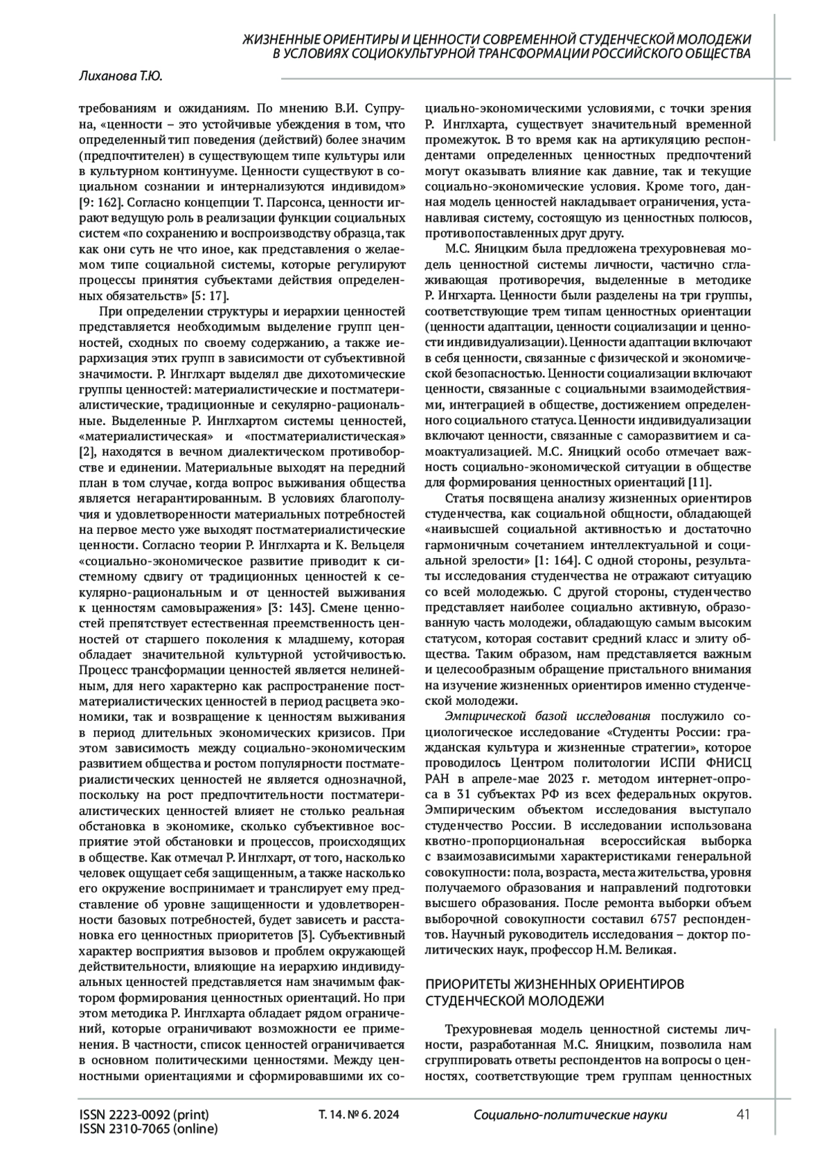 ЛИХАНОВА Т. Ю. ЖИЗНЕННЫЕ ОРИЕНТИРЫ И ЦЕННОСТИ СОВРЕМЕННОЙ СТУДЕНЧЕСКОЙ МОЛОДЕЖИ В УСЛОВИЯХ СОЦИОКУЛЬТУРНОЙ ТРАНСФОРМАЦИИ РОССИЙСКОГО ОБЩЕСТВА (ПО РЕЗУЛЬТАТАМ СОЦИОЛОГИЧЕСКОГО ОПРОСА) // СОЦИАЛЬНО-ПОЛИТИЧЕСКИЕ НАУКИ. 2024. Т. 14 № 6