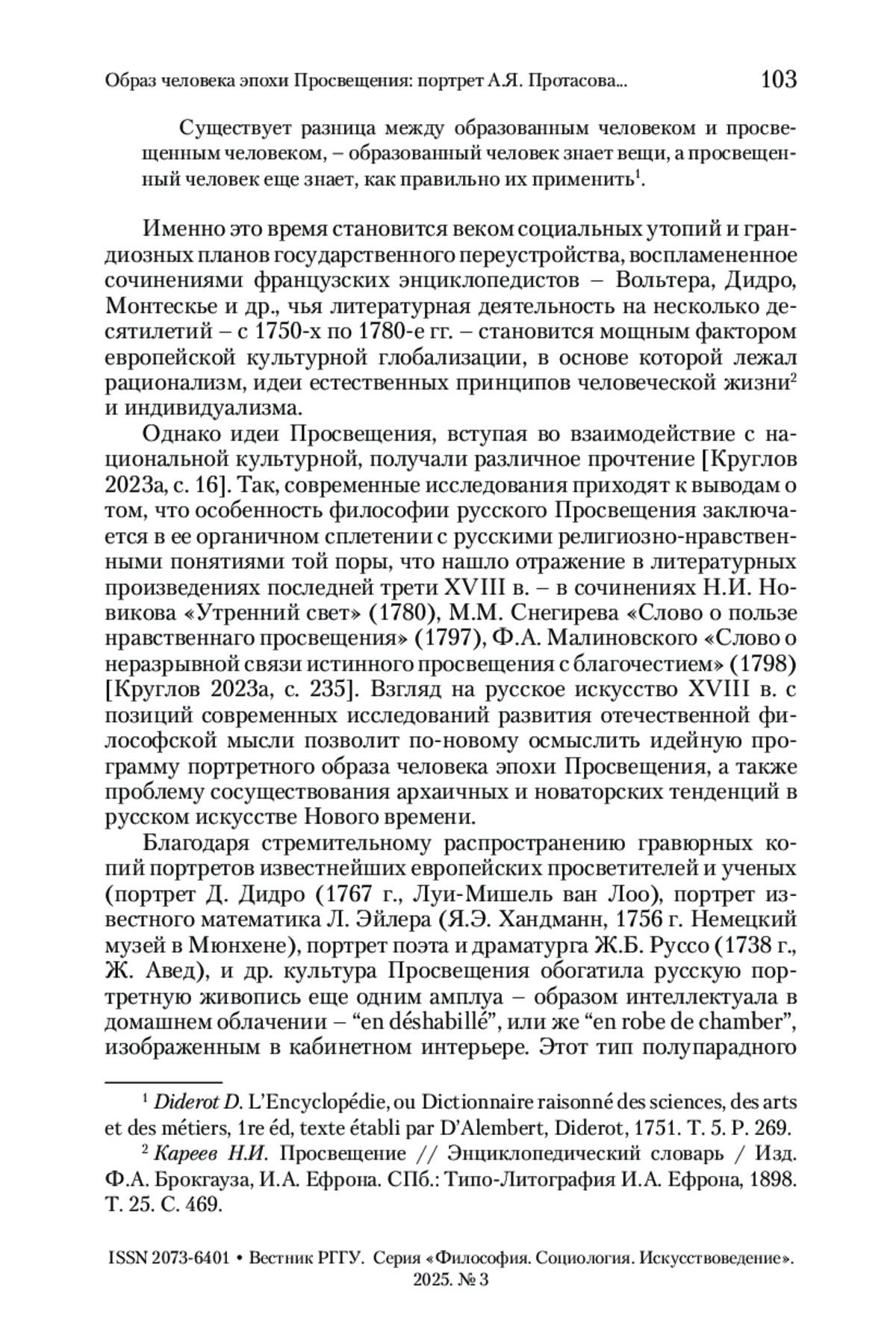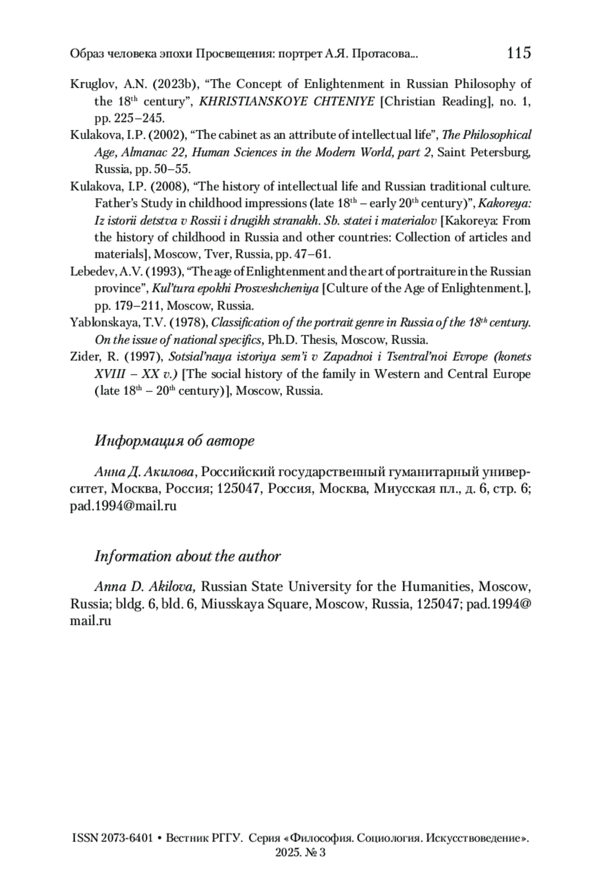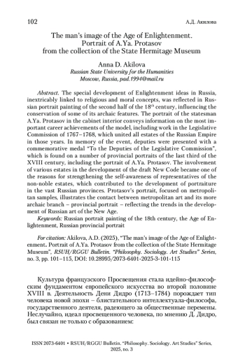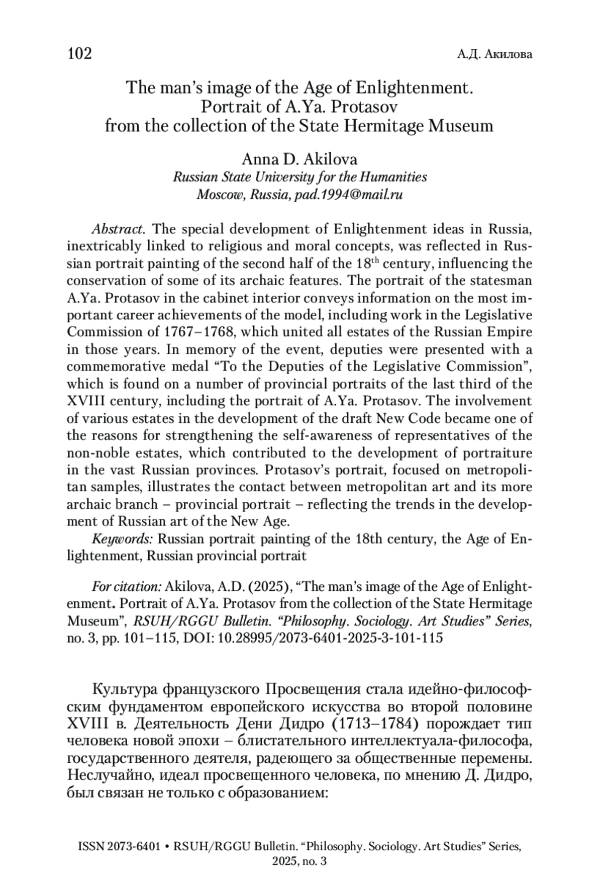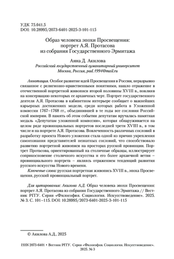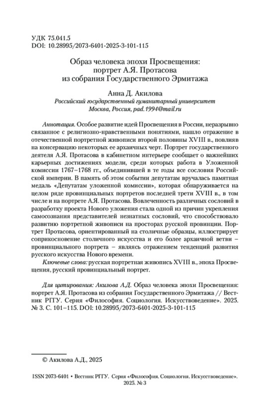 АКИЛОВА А. Д. ОБРАЗ ЧЕЛОВЕКА ЭПОХИ ПРОСВЕЩЕНИЯ: ПОРТРЕТ А. Я. ПРОТАСОВА ИЗ СОБРАНИЯ ГОСУДАРСТВЕННОГО ЭРМИТАЖА // ВЕСТНИК РГГУ. СЕРИЯ: ФИЛОСОФИЯ. СОЦИОЛОГИЯ. ИСКУССТВОВЕДЕНИЕ. 2025. № 3