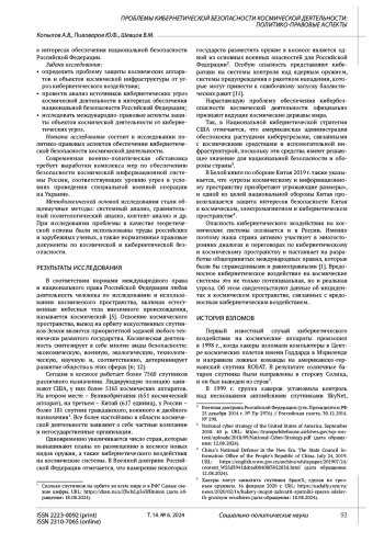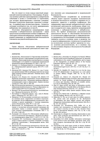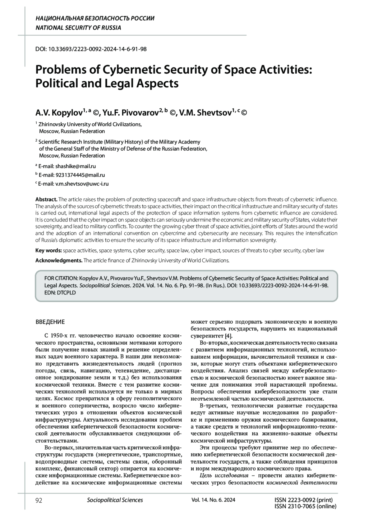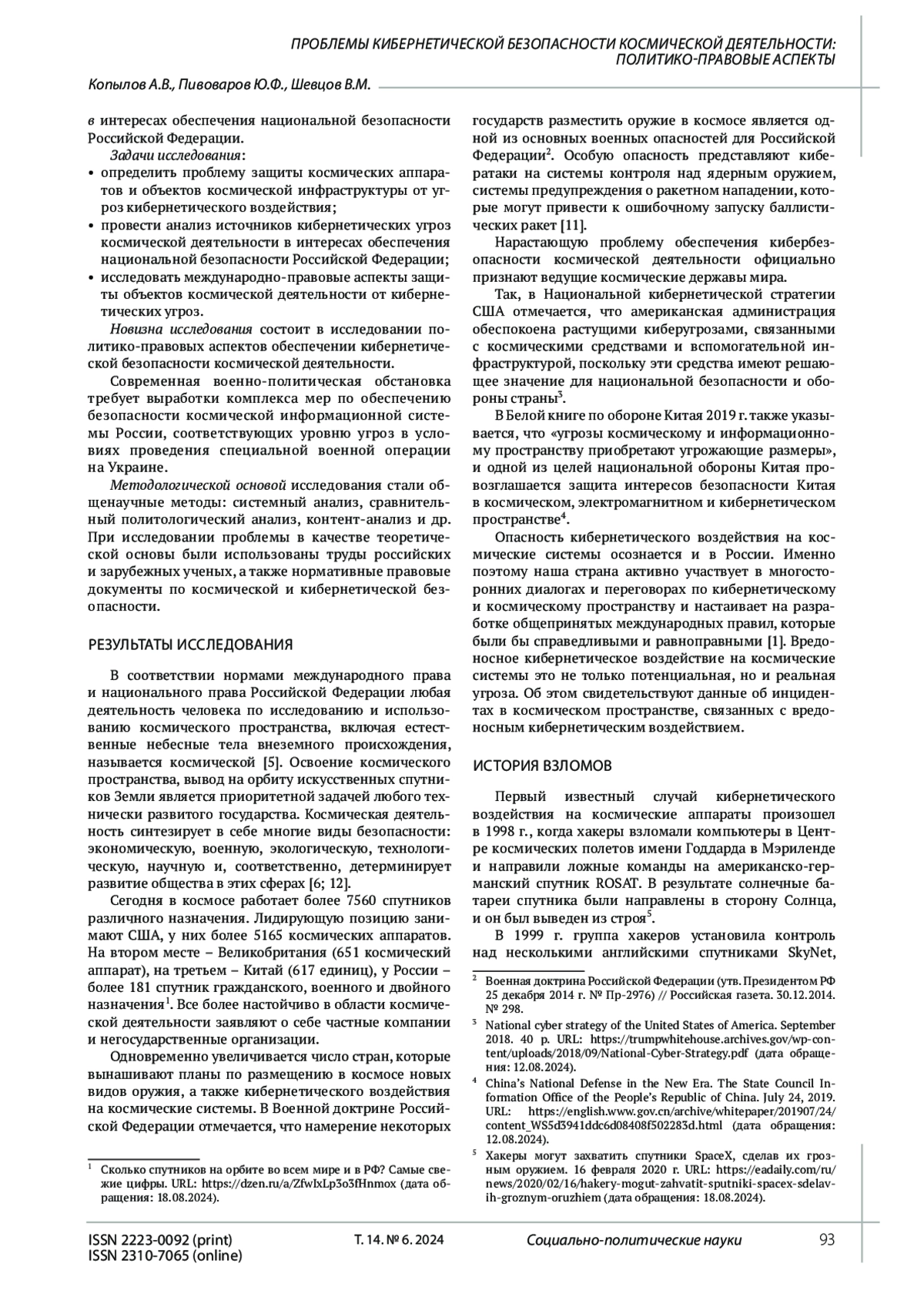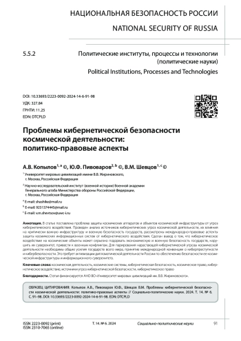 КОПЫЛОВ А. В., ПИВОВАРОВ Ю. Ф., ШЕВЦОВ В. М. ПРОБЛЕМЫ КИБЕРНЕТИЧЕСКОЙ БЕЗОПАСНОСТИ КОСМИЧЕСКОЙ ДЕЯТЕЛЬНОСТИ: ПОЛИТИКО-ПРАВОВЫЕ АСПЕКТЫ // СОЦИАЛЬНО-ПОЛИТИЧЕСКИЕ НАУКИ. 2024. Т. 14 № 6