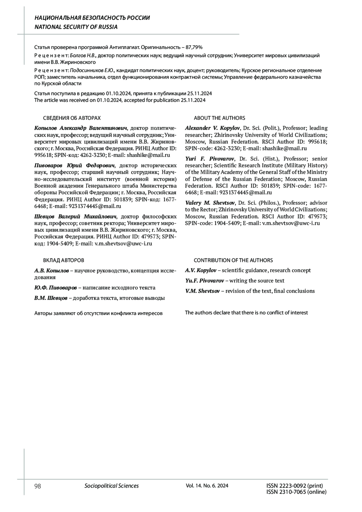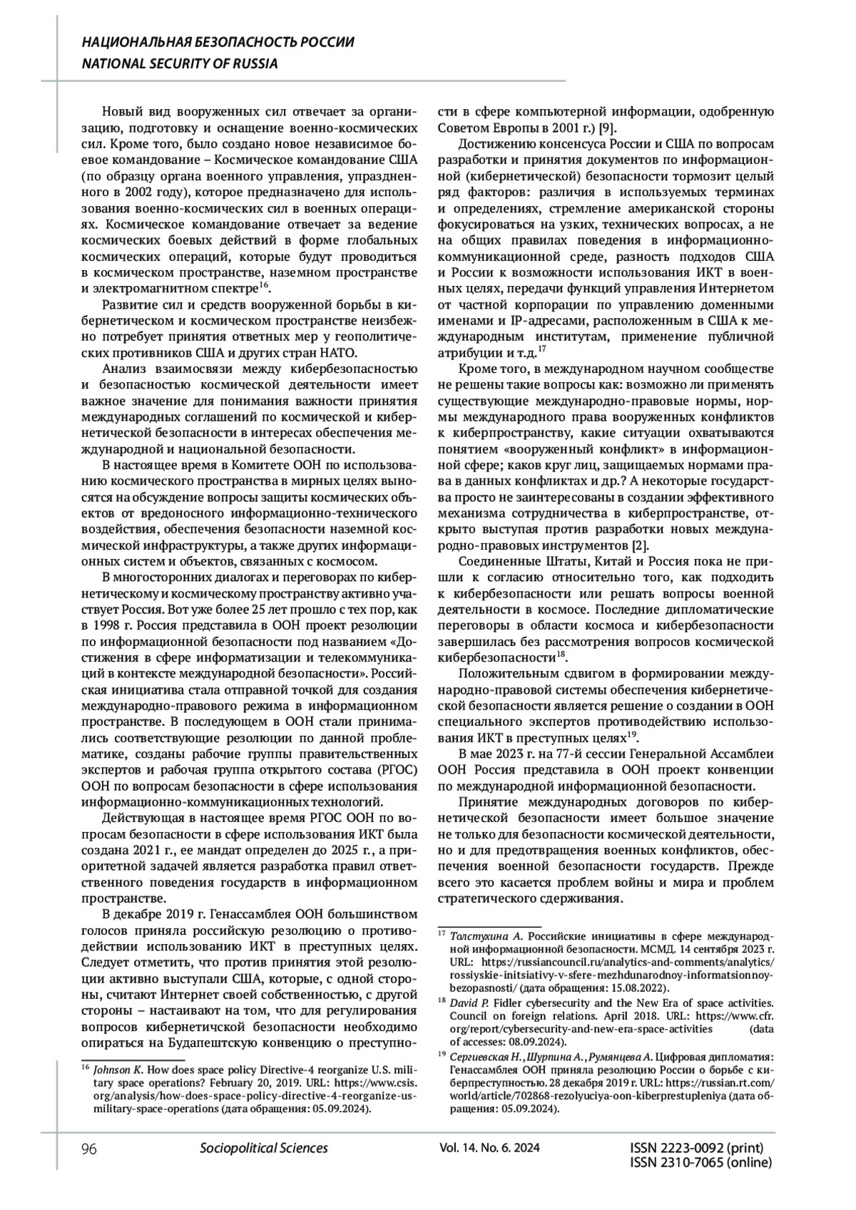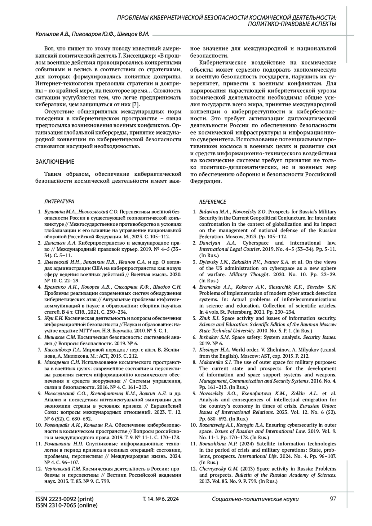 КОПЫЛОВ А. В., ПИВОВАРОВ Ю. Ф., ШЕВЦОВ В. М. ПРОБЛЕМЫ КИБЕРНЕТИЧЕСКОЙ БЕЗОПАСНОСТИ КОСМИЧЕСКОЙ ДЕЯТЕЛЬНОСТИ: ПОЛИТИКО-ПРАВОВЫЕ АСПЕКТЫ // СОЦИАЛЬНО-ПОЛИТИЧЕСКИЕ НАУКИ. 2024. Т. 14 № 6