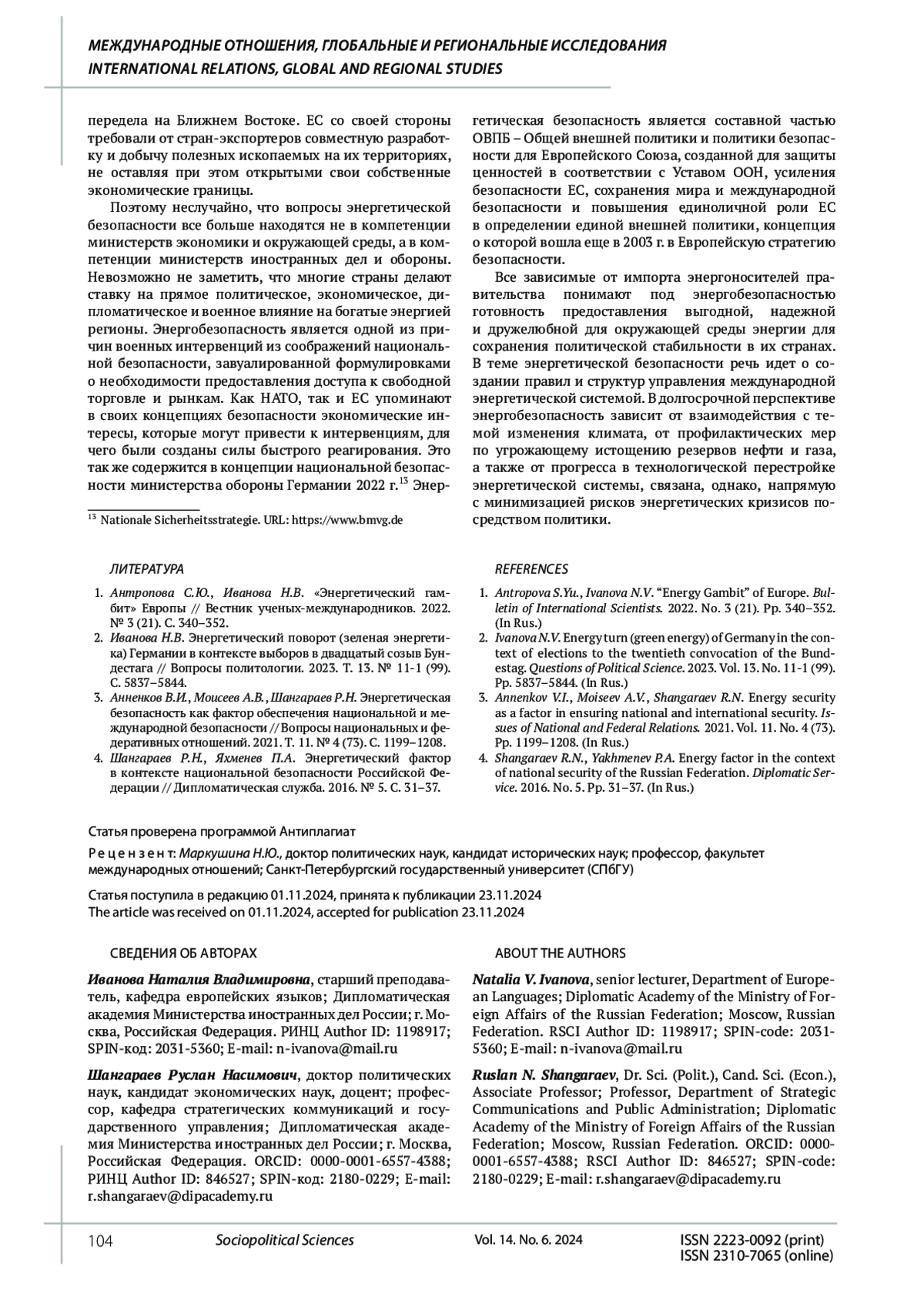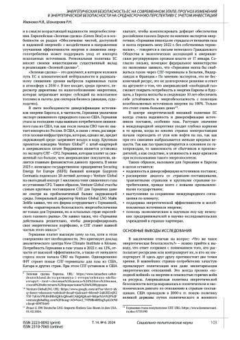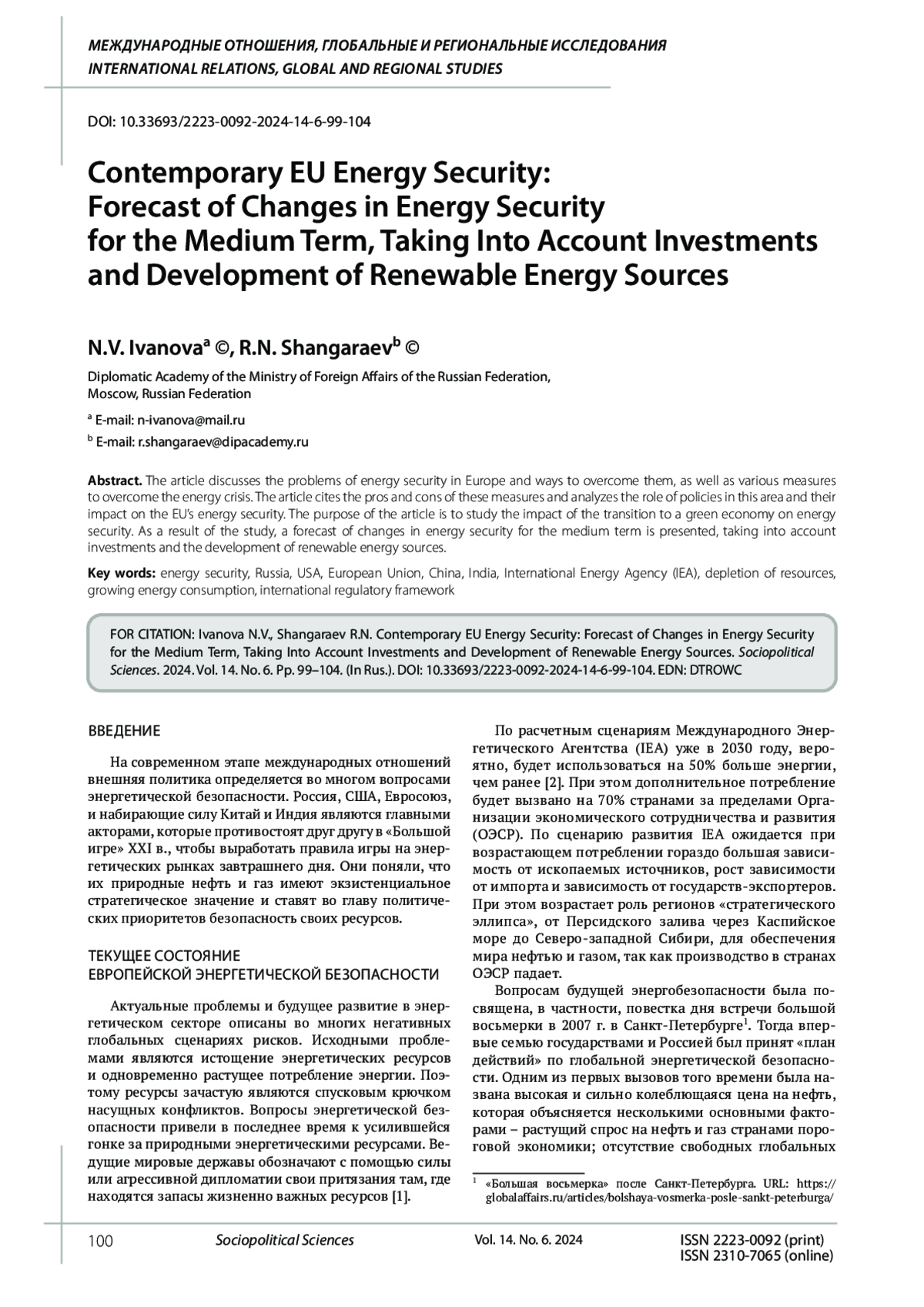 ИВАНОВА Н. В., ШАНГАРАЕВ Р. Н. ЭНЕРГЕТИЧЕСКАЯ БЕЗОПАСНОСТЬ ЕС НА СОВРЕМЕННОМ ЭТАПЕ: ПРОГНОЗ ИЗМЕНЕНИЙ В ЭНЕРГЕТИЧЕСКОЙ БЕЗОПАСНОСТИ НА СРЕДНЕСРОЧНУЮ ПЕРСПЕКТИВУ С УЧЕТОМ ИНВЕСТИЦИЙ И РАЗВИТИЯ ВОЗОБНОВЛЯЕМЫХ ИСТОЧНИКОВ ЭНЕРГИИ // СОЦИАЛЬНО-ПОЛИТИЧЕСКИЕ НАУКИ. 2024. Т. 14 № 6
