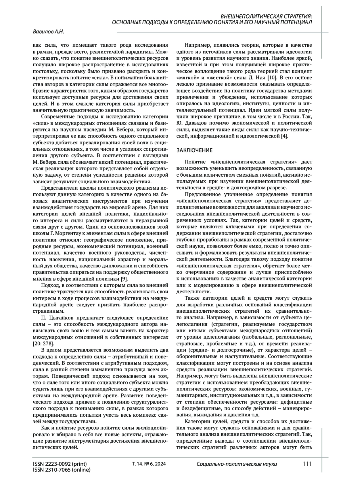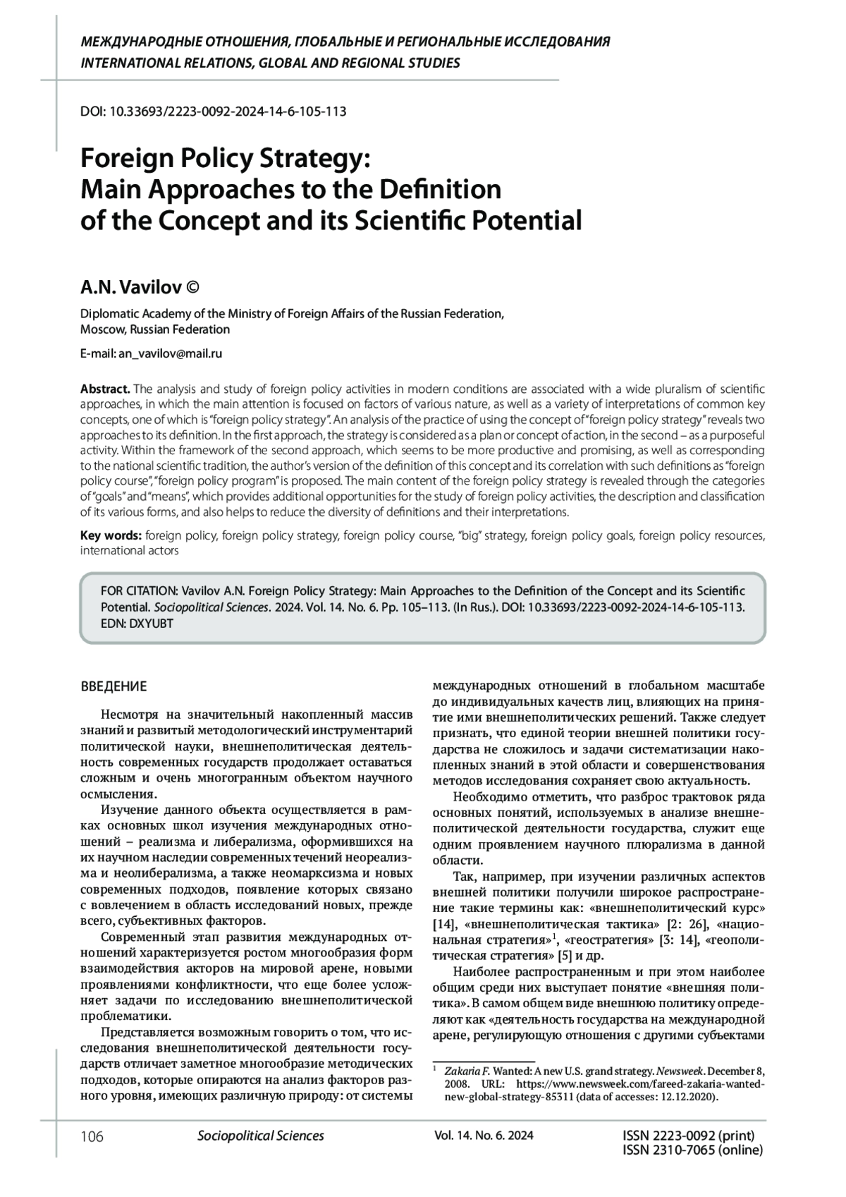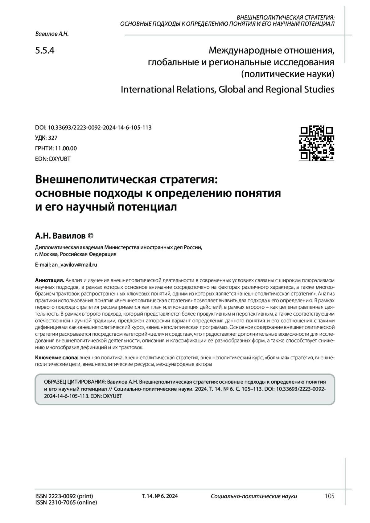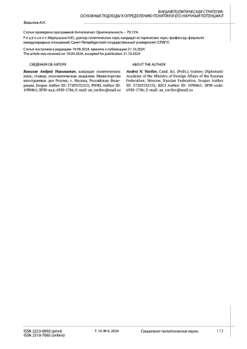 ВАВИЛОВ А. Н. ВНЕШНЕПОЛИТИЧЕСКАЯ СТРАТЕГИЯ: ОСНОВНЫЕ ПОДХОДЫ К ОПРЕДЕЛЕНИЮ ПОНЯТИЯ И ЕГО НАУЧНЫЙ ПОТЕНЦИАЛ // СОЦИАЛЬНО-ПОЛИТИЧЕСКИЕ НАУКИ. 2024. Т. 14 № 6