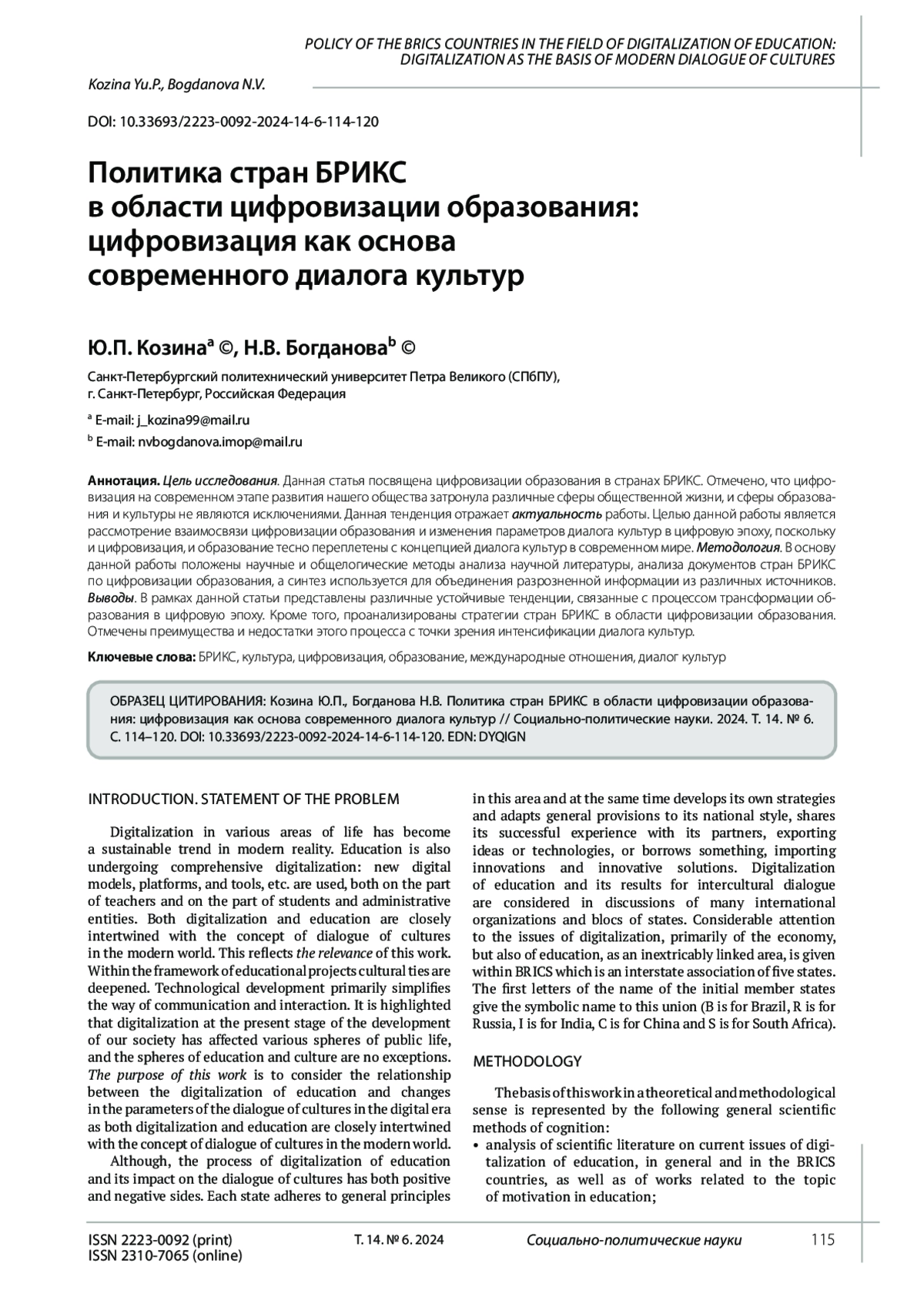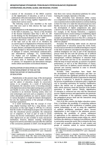 9. Pletyago T., Antonova S. BRICS in creating digital educational environments: Social and legal aspects of “a new normal”. BRICS Law Journal. 2023. No. 2. Рp. 101-121. DOI: 10.21684/2412-2343-2023-10-2-101-122 EDN: PDTVZT