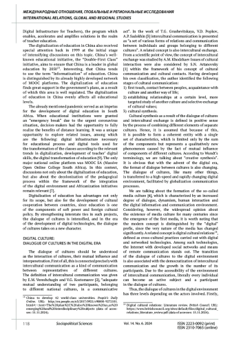Цель исследования. Данная статья посвящена цифровизации образования в странах БРИКС. Отмечено, что цифровизация на современном этапе развития нашего общества затронула различные сферы общественной жизни, и сферы образования и культуры не являются исключениями. Данная тенденция отражает актуальность работы. Целью данной работы является рассмотрение взаимосвязи цифровизации образования и изменения параметров диалога культур в цифровую эпоху, поскольку и цифровизация, и образование тесно переплетены с концепцией диалога культур в современном мире. Методология. В основу данной работы положены научные и общелогические методы анализа научной литературы, анализа документов стран БРИКС по цифровизации образования, а синтез используется для объединения разрозненной информации из различных источников. Выводы. В рамках данной статьи представлены различные устойчивые тенденции, связанные с процессом трансформации образования в цифровую эпоху. Кроме того, проанализированы стратегии стран БРИКС в области цифровизации образования. Отмечены преимущества и недостатки этого процесса с точки зрения интенсификации диалога культур.